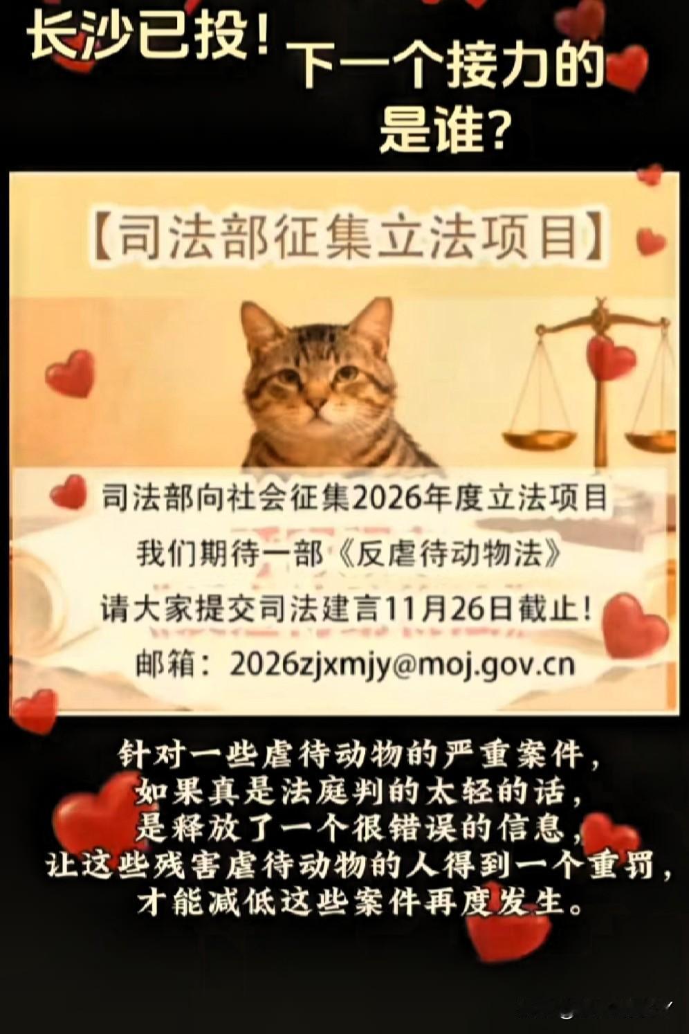 好消息:为毛孩子立法啦!《反虐待动物法》征集建言,长沙已接力,你也别错过! 司法部正在征集2026年度立法项目,大家一起呼吁推动《反虐待动物法》出台。 面对虐待动物的恶劣行径,轻判无疑是释放错误信号,唯有重罚才能有效遏制!长沙以付诸行动,11月26日前,赶快通过邮箱:2026zjxmjy@moj.gov.cn提交建言,为守护毛孩子贡献一份力量,让每一次接力都化作动物保护的坚持铠甲!