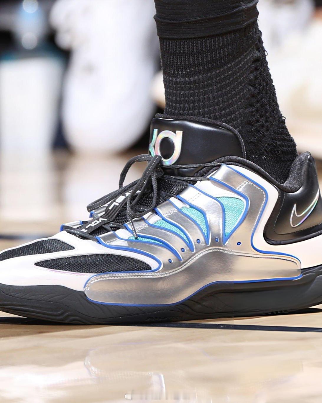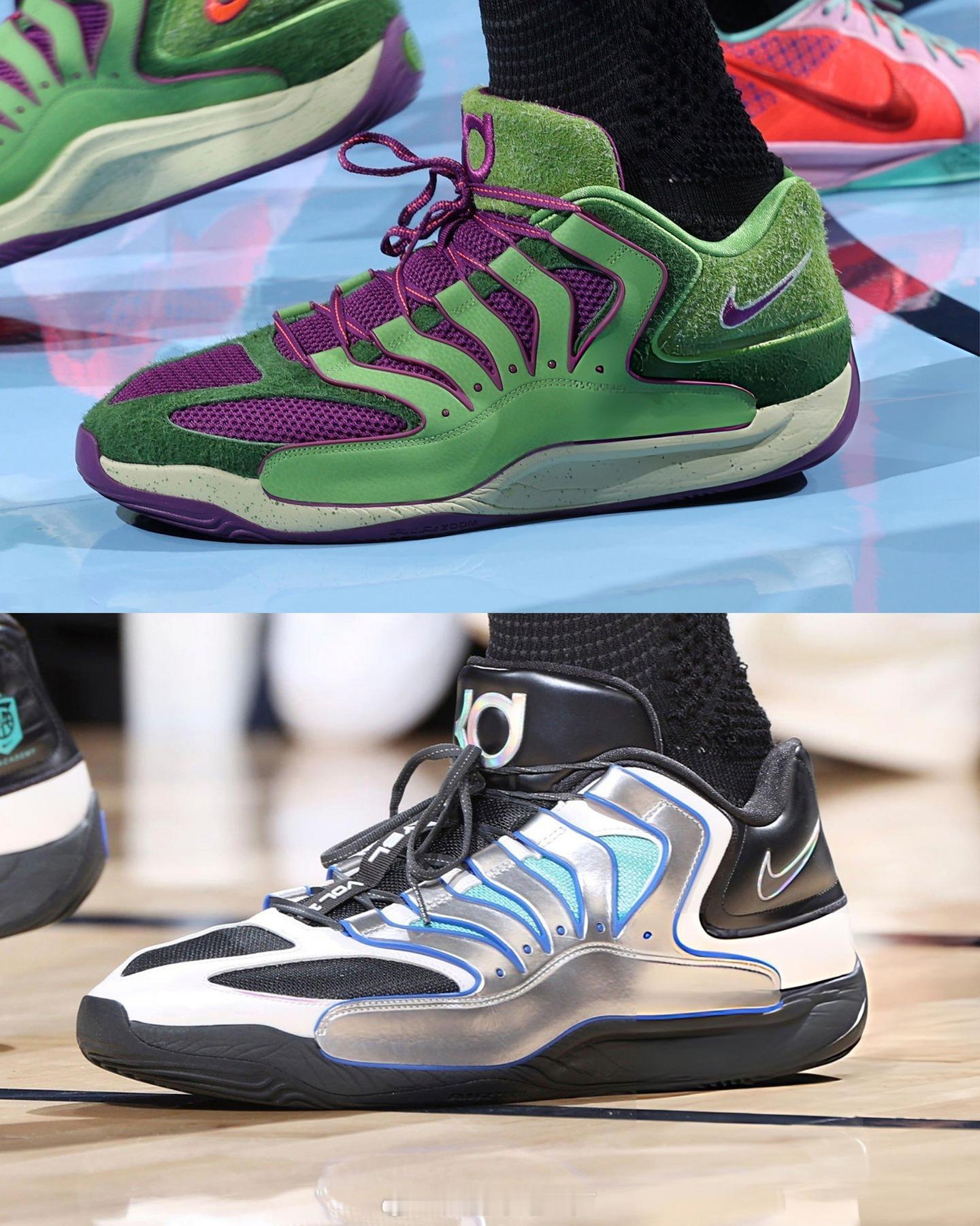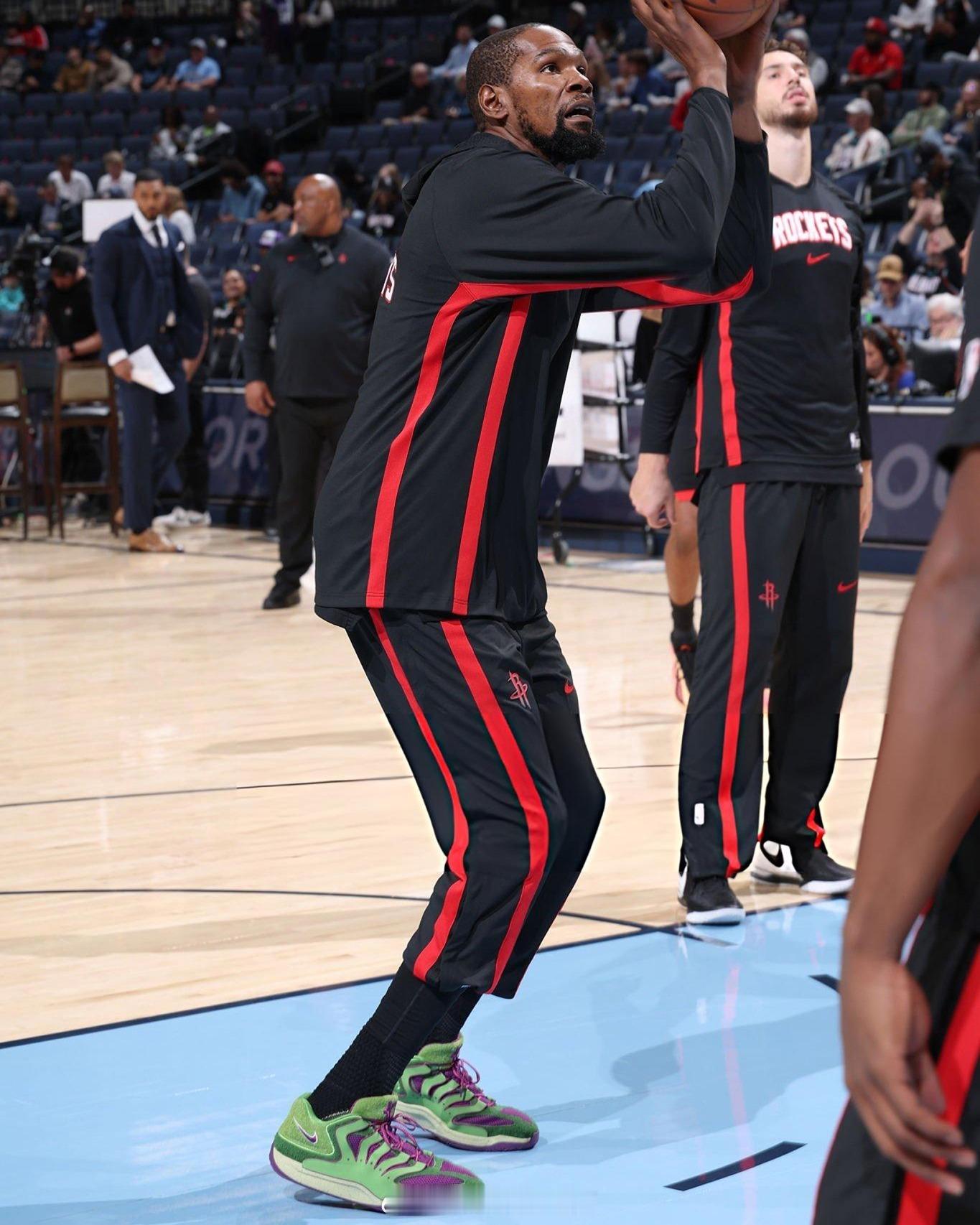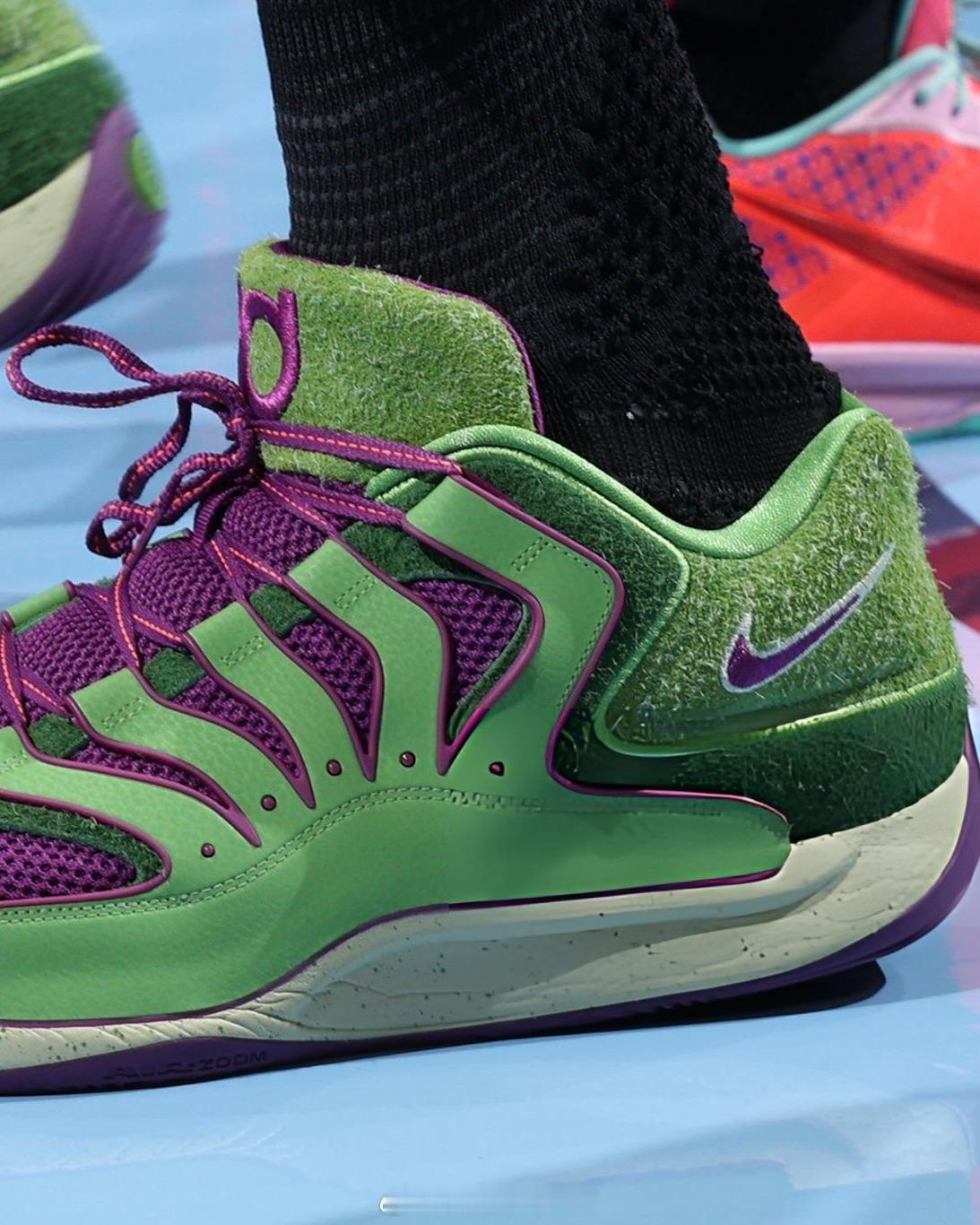 杜兰特昨日赛前热身中,上脚绿紫色Nike KD18 PE。