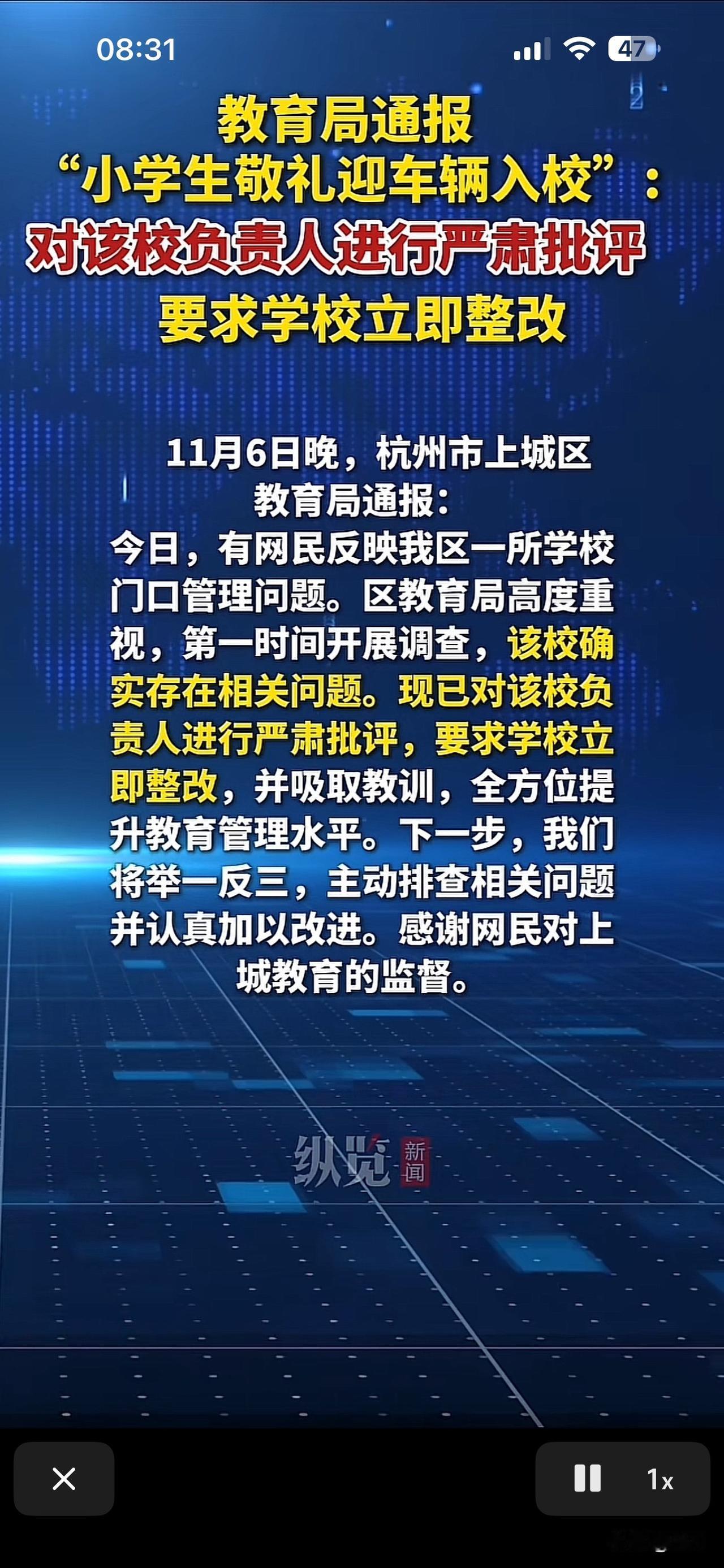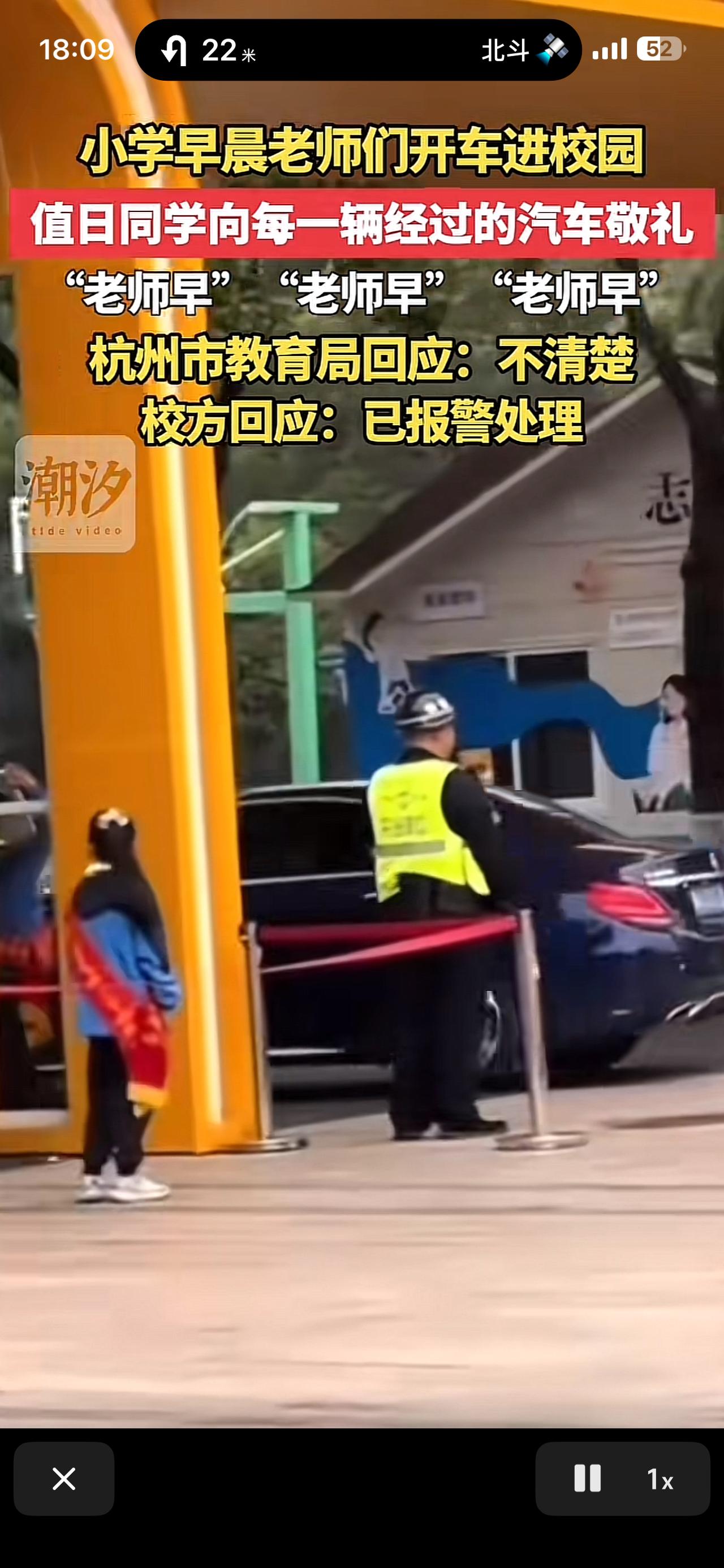 我的今日状态:🏝️旅行度假 我这里的天气:🍂微风 杭州小学早晨老师们开车🚗进学校🏫,值日同学向每一辆车经过的汽车🚗敬礼。杭州教育局:不清楚。当地涉事校园:已报警处理。 随后当地迅速作出反应,针对这个事情进行严肃批评,要求学校立刻整改,并吸取教训。
