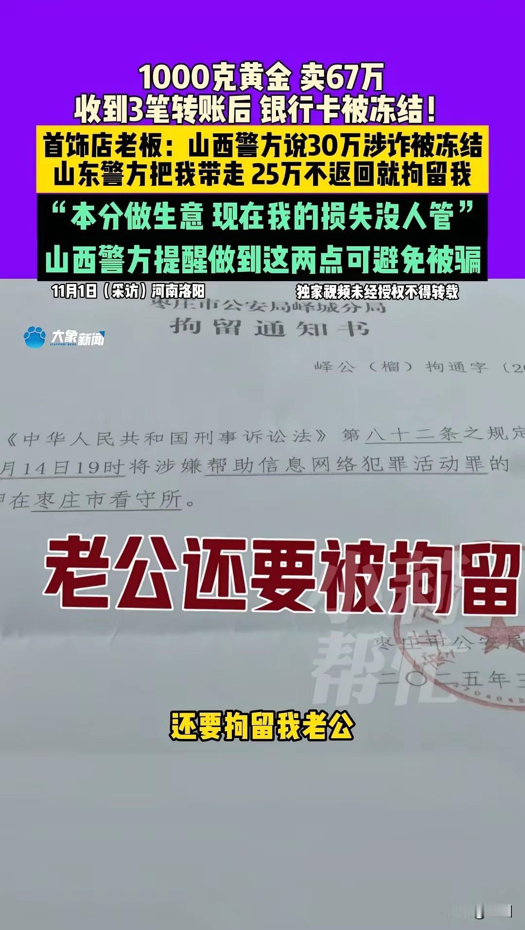 首饰店老板,山西警方👮说30万涉嫌诈骗被冻结。山东警方把我带走,25万不返回就拘留我。金店老板说:自己是一个本分做生意的人,现在金店的损失,没人管。 针对此事,大家怎么看?