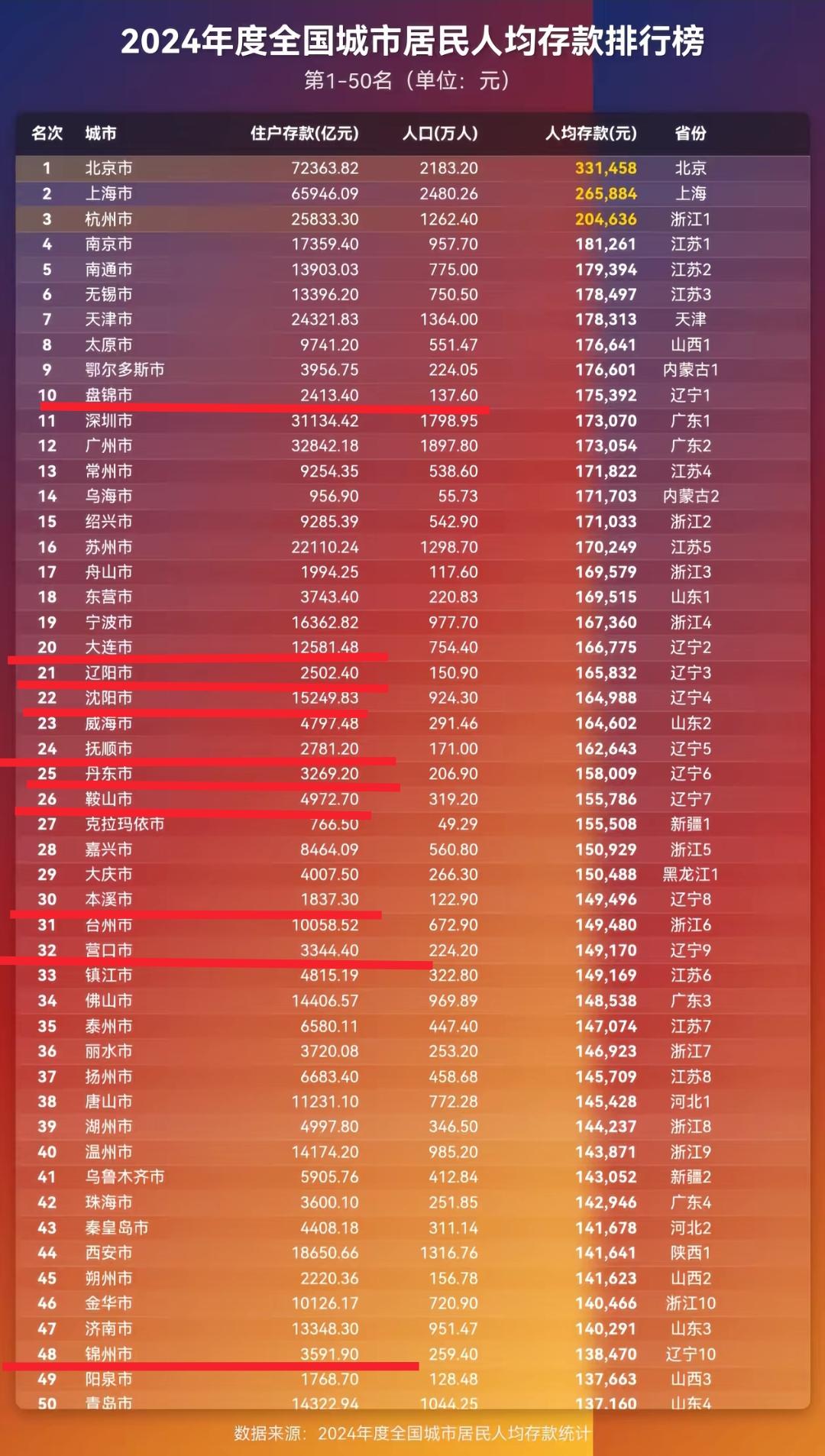 从网友的数据看盘锦人均存款排在前10名,整个辽宁省有10座城市人均存款排在前50名。见此情景不禁感慨辽宁省幸福指数还是很高的,老年人的生活品质很不错。再加上辽宁省物价比较便宜,在工作中只要稍微卖点力气就能过上丰衣足食的生活,这样的辽宁确实令人向往。 说到最后还是期待朝阳、铁岭、葫芦岛、阜新能加把劲,希望今后这些城市的人均存款能越来越高。