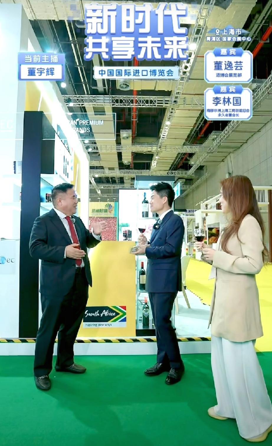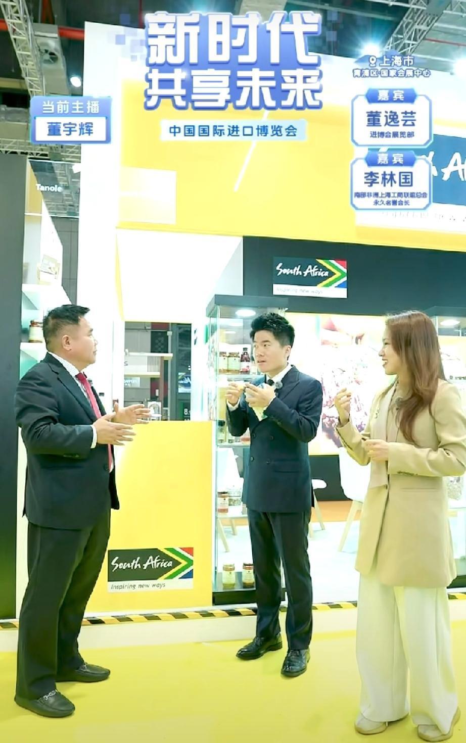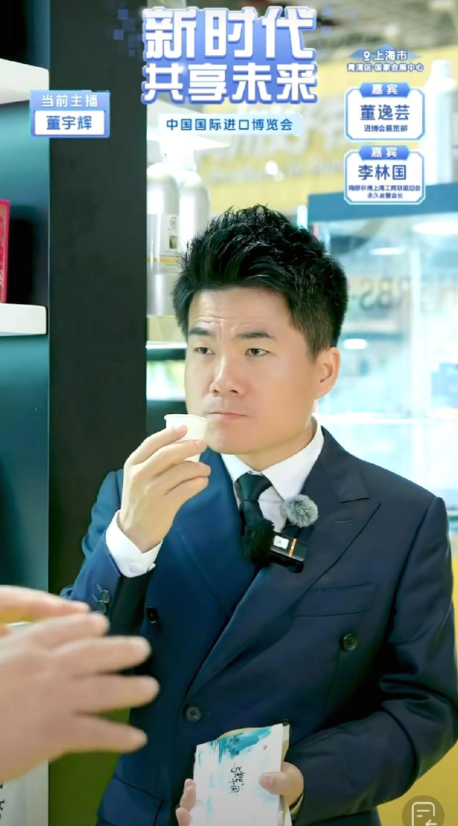 果然姜还是老的辣!南非上海工商联谊总会永久名誉会长李会长现场邀请董宇辉做南非产品的代言人。李会长在有限的时间给董宇辉做了所有产品的介绍,其中包括南非的面包树果汁、夏威夷果、南非的国宝茶、葡萄酒。 我们也跟着学了不少知识。 原来面包树果汁是含丰富的维C能量特别的大,董宇辉尝过后觉得口感很好,便想买上一包。李会长当然不能让宇辉出钱,直接赠送一包。 原来夏威夷果出口量最大的居然是南非。没想到夏威夷果产地在南非,出口量最大的也是南非,更没想到的是,98%出口到中国! 李会长说,希望经过董宇辉的平台,把他们的国宝茶推荐给更多的人;也说了在宇辉面前说葡萄酒是班门弄斧;说他介绍的只是南非一角。 南非馆逛馆结束时,董宇辉说,你后期安排人和我们对接事宜。你今天所说的,你说是南非一角,我觉得是好望角,因为都是好物。 看来在不久的将来,可能在与辉同行能买到南非的面包树果汁和南非的国宝茶了。 董宇辉 与辉同行