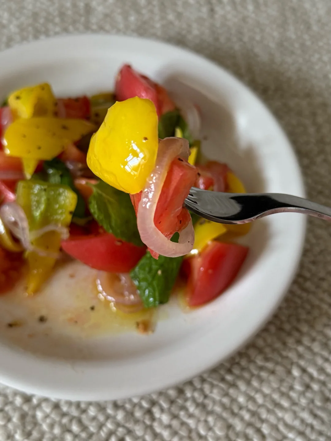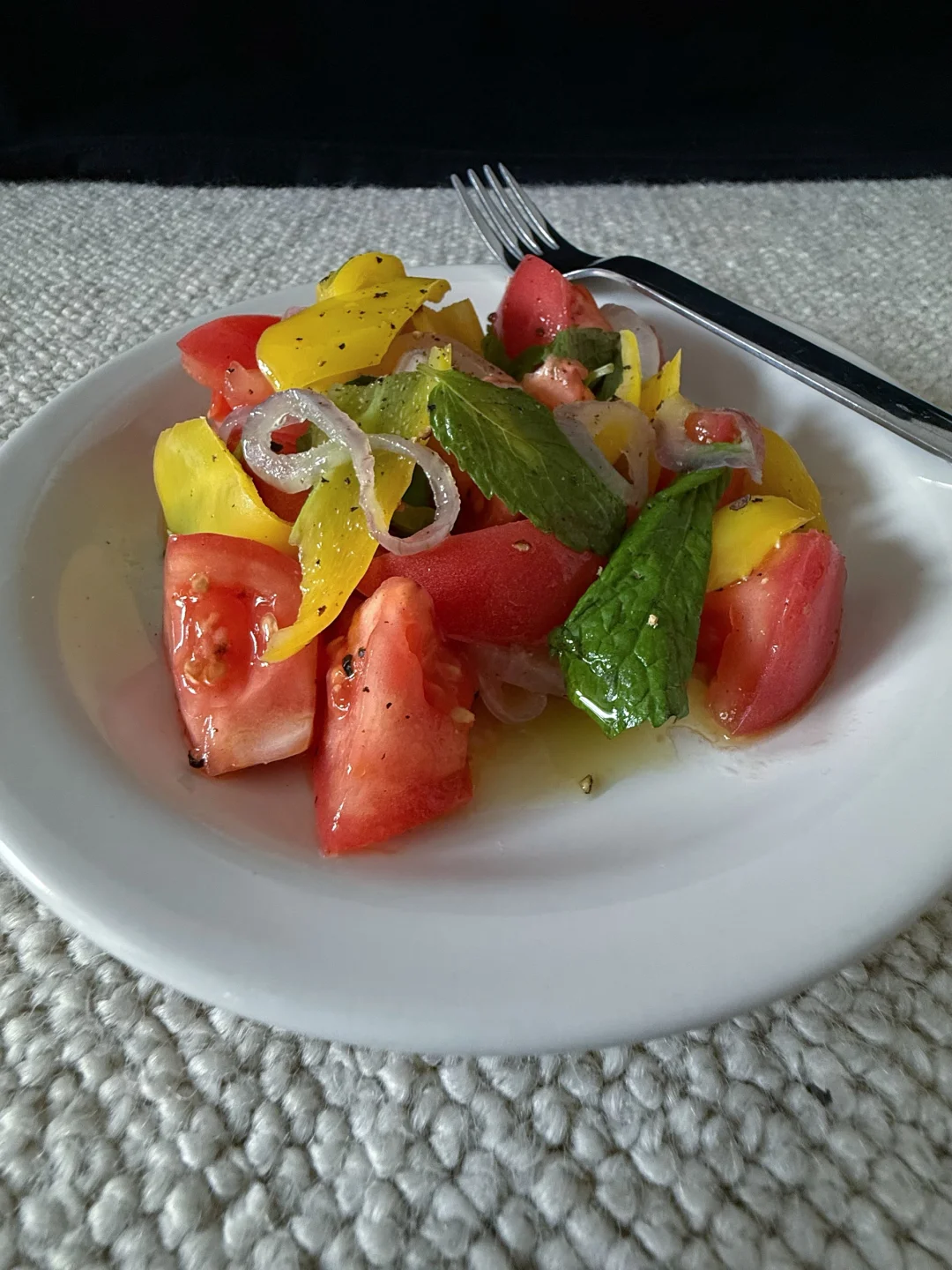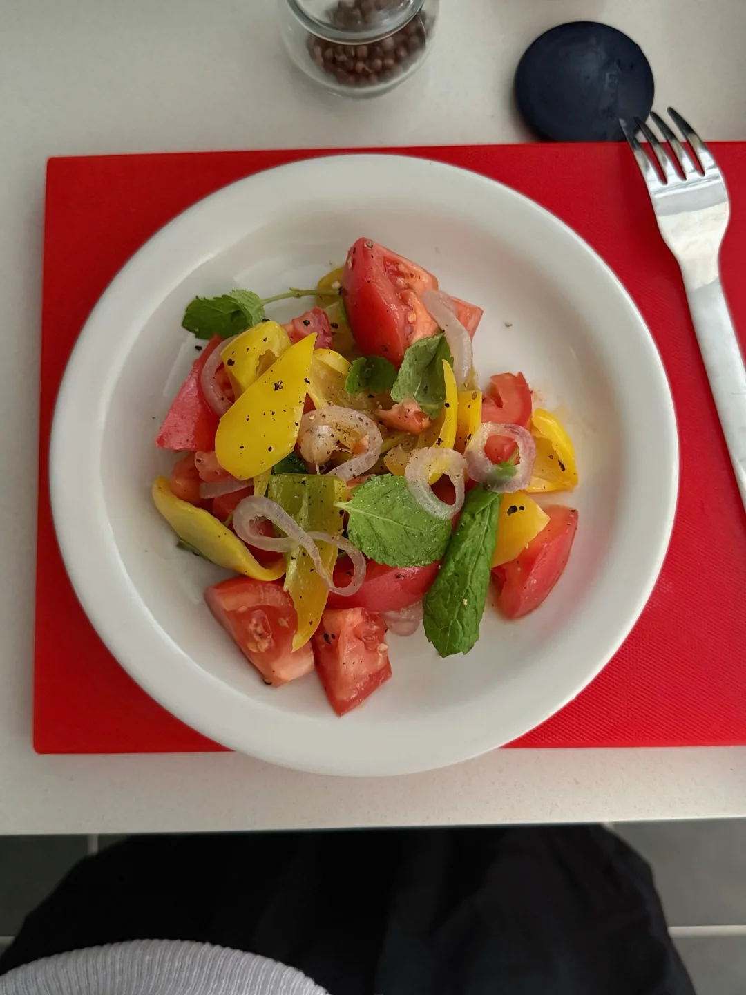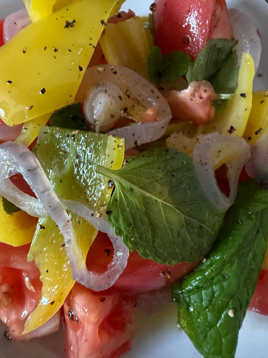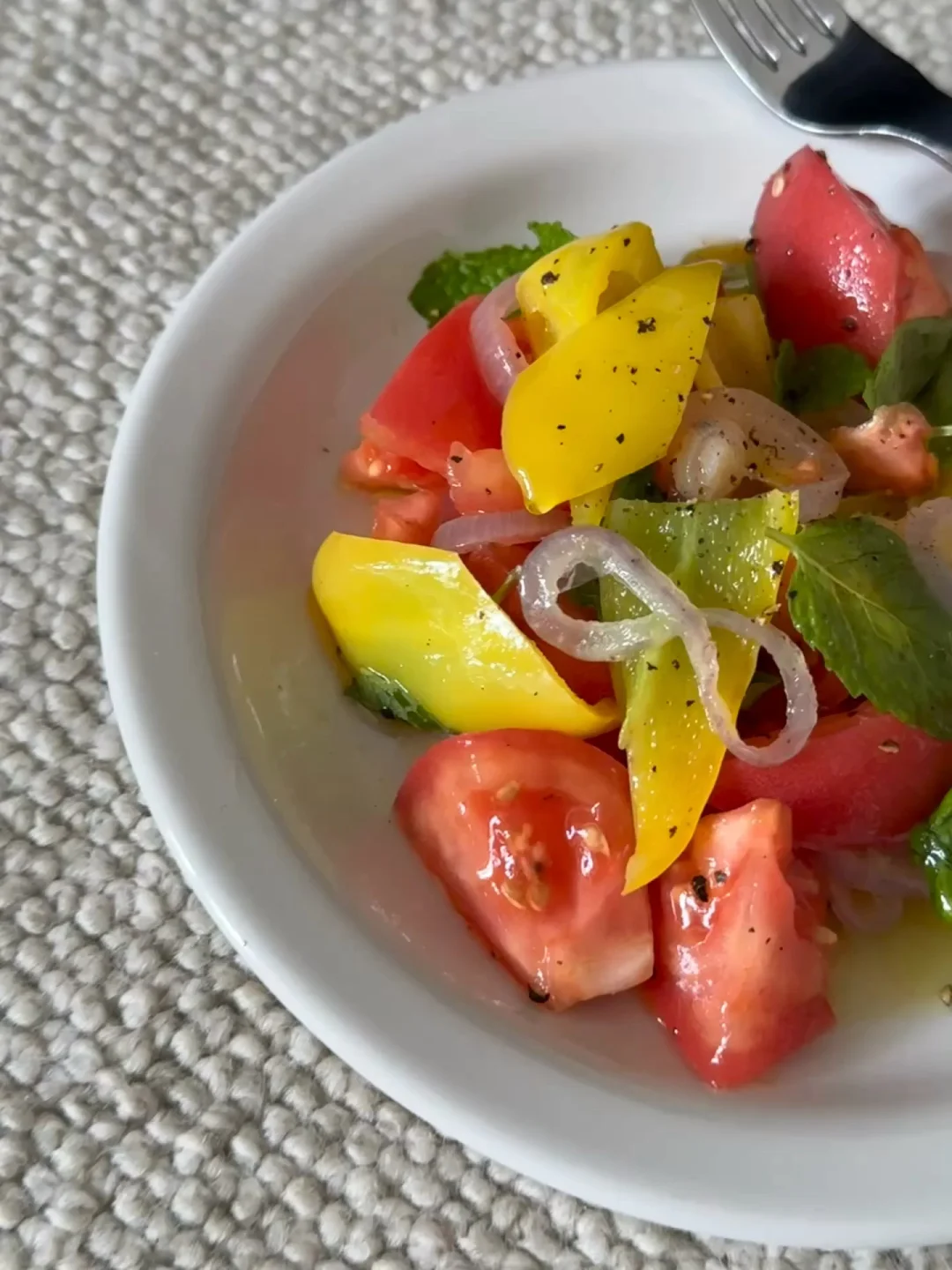 来自伦敦小酒馆沙拉菜单 搭配一点干红或者气泡酒小酌微醺都不错~ 🧑🏽🍳 小洋葱 彩椒 加海盐橄榄油胡椒 进微波炉高火一分半 直接倒入切好的🍅软番茄(选择多汁的 一瓶盖朗姆酒 /1/4柠檬汁 /半勺蜂蜜 /拍4-5片薄荷 翻拌即可 家里有奶酪的也可以刨一点上去 - 很适合晚餐减肥懒得吃饭来一盘 清爽juice~ 辛辣微甜 非常神奇的口感 个人觉得配口感厚重一点的酒 我看原版配的有干酪 适合小夫妻俩人对饮聊聊天哈哈哈哈👩🏾❤️💋👨🏼 舒适生活~