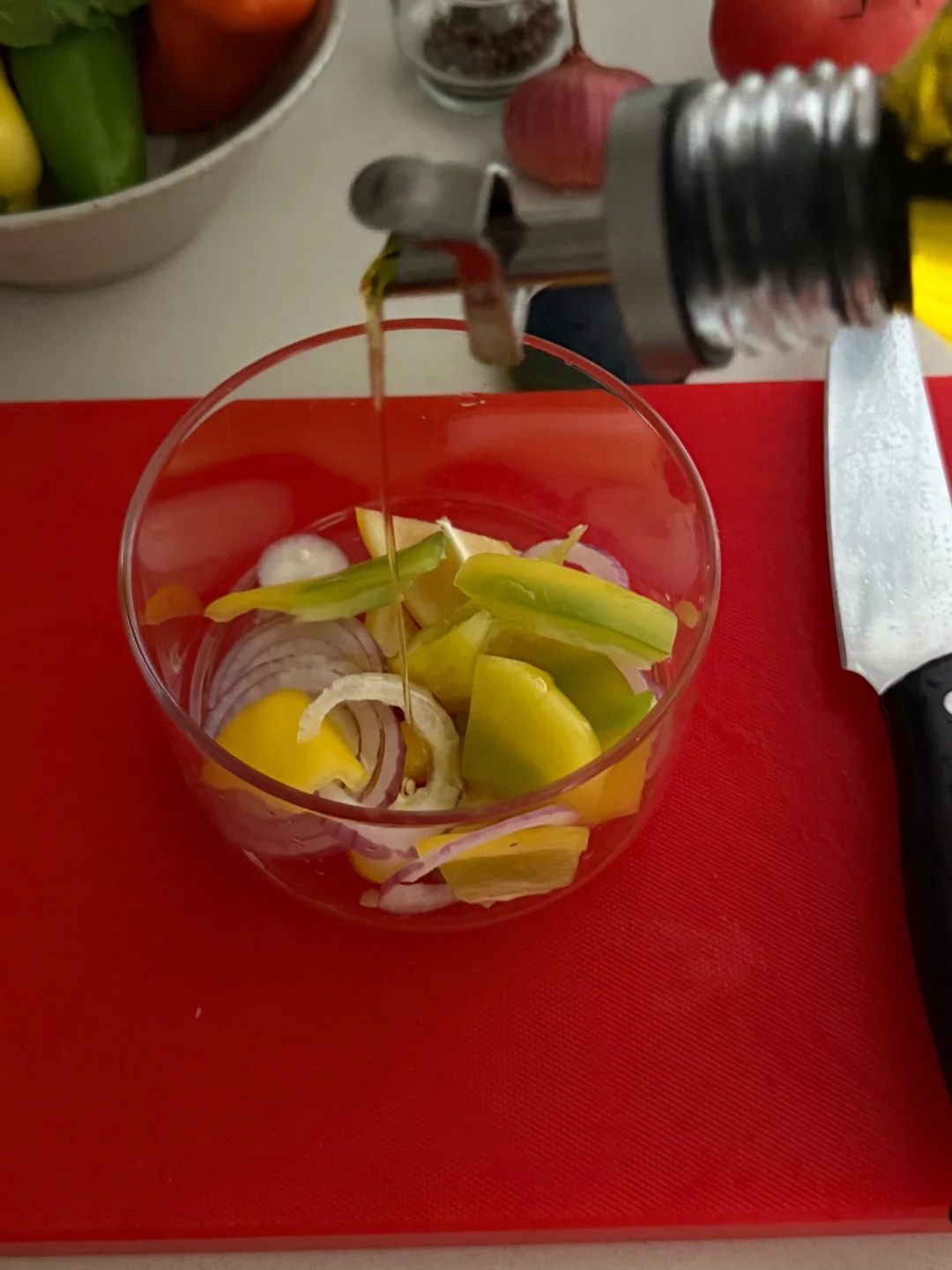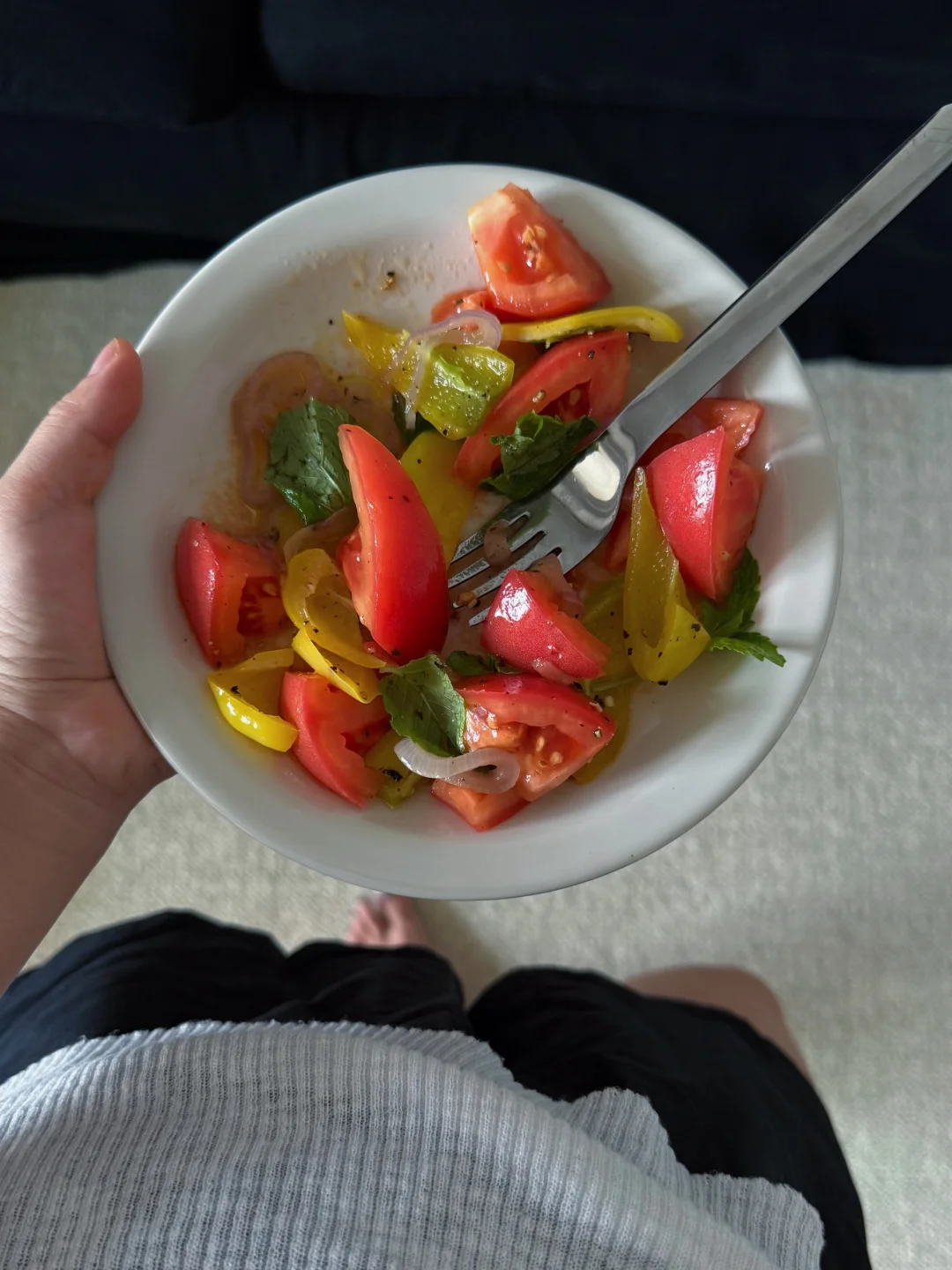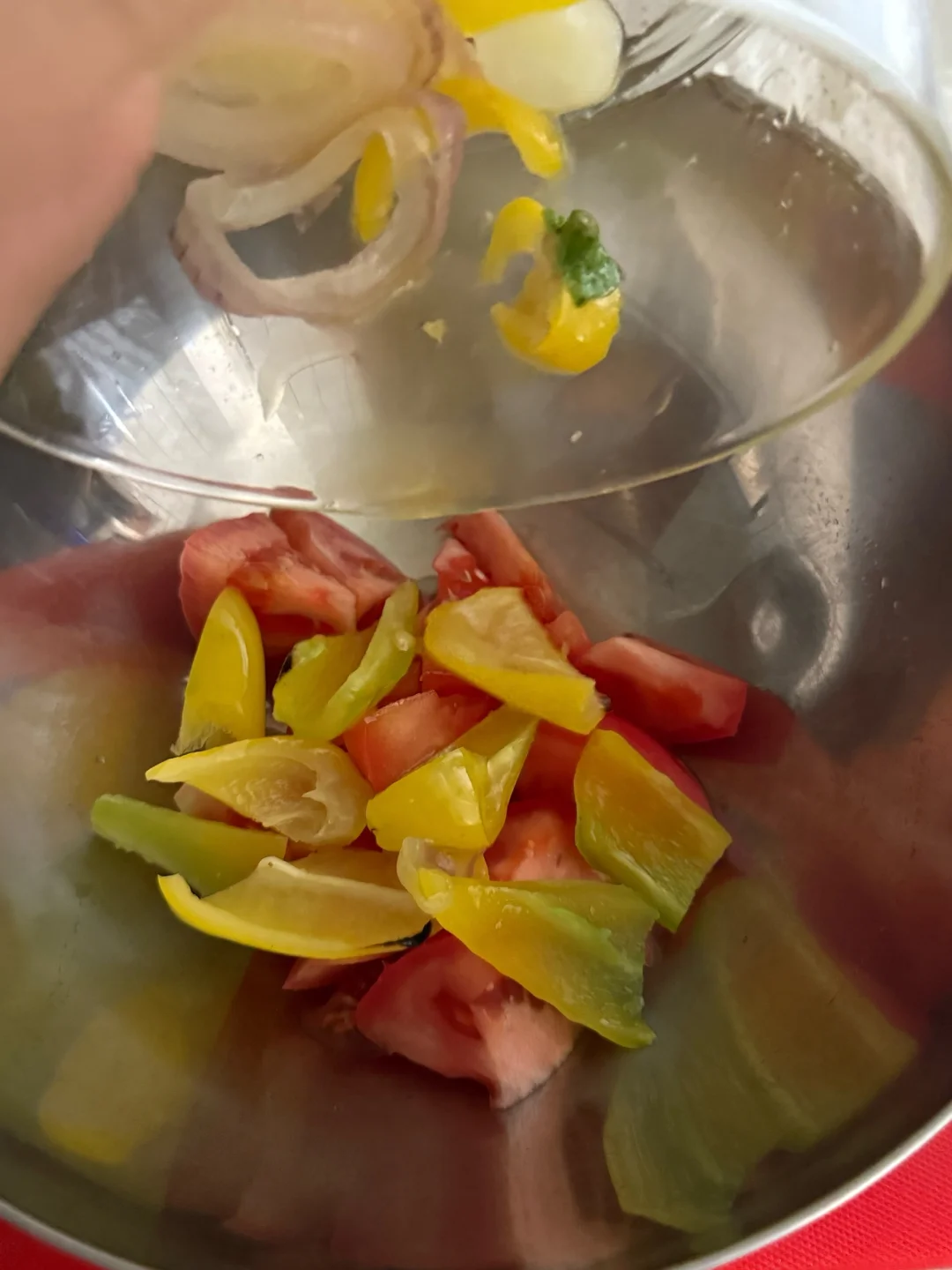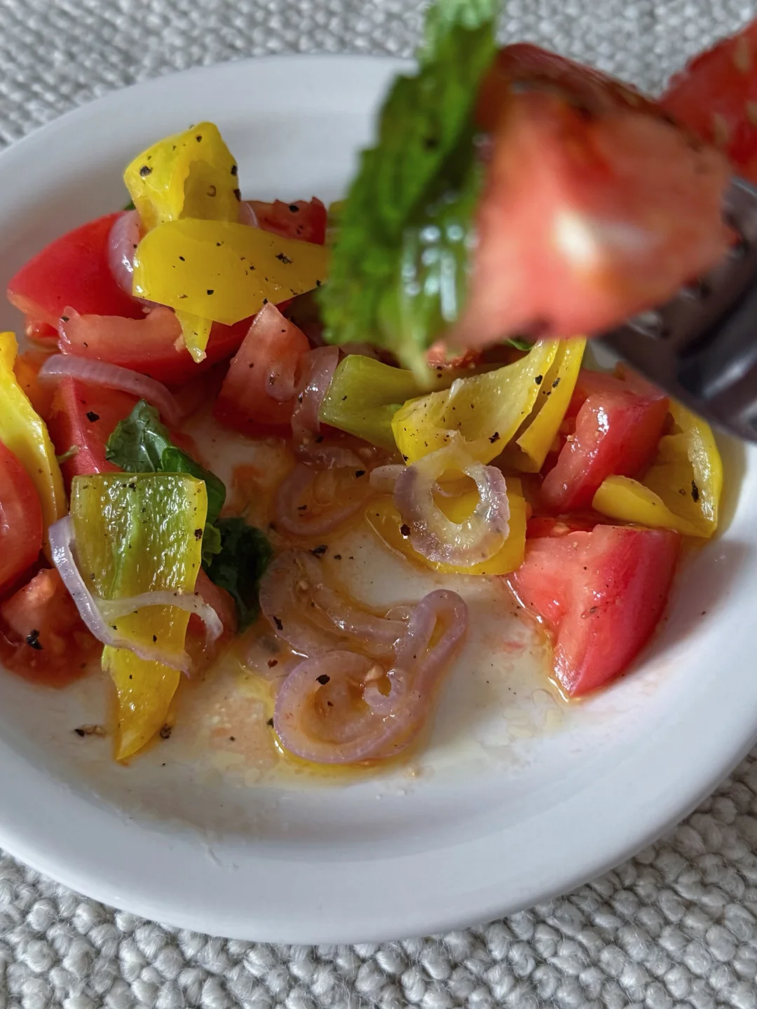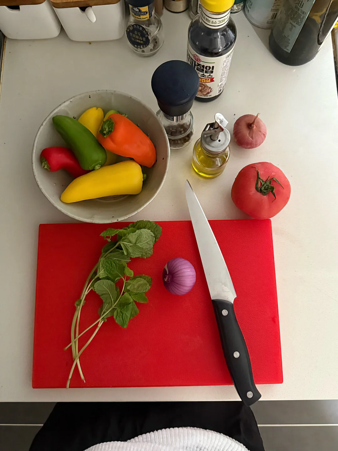 来自伦敦小酒馆沙拉菜单 搭配一点干红或者气泡酒小酌微醺都不错~ 🧑🏽🍳 小洋葱 彩椒 加海盐橄榄油胡椒 进微波炉高火一分半 直接倒入切好的🍅软番茄(选择多汁的 一瓶盖朗姆酒 /1/4柠檬汁 /半勺蜂蜜 /拍4-5片薄荷 翻拌即可 家里有奶酪的也可以刨一点上去 - 很适合晚餐减肥懒得吃饭来一盘 清爽juice~ 辛辣微甜 非常神奇的口感 个人觉得配口感厚重一点的酒 我看原版配的有干酪 适合小夫妻俩人对饮聊聊天哈哈哈哈👩🏾❤️💋👨🏼 舒适生活~