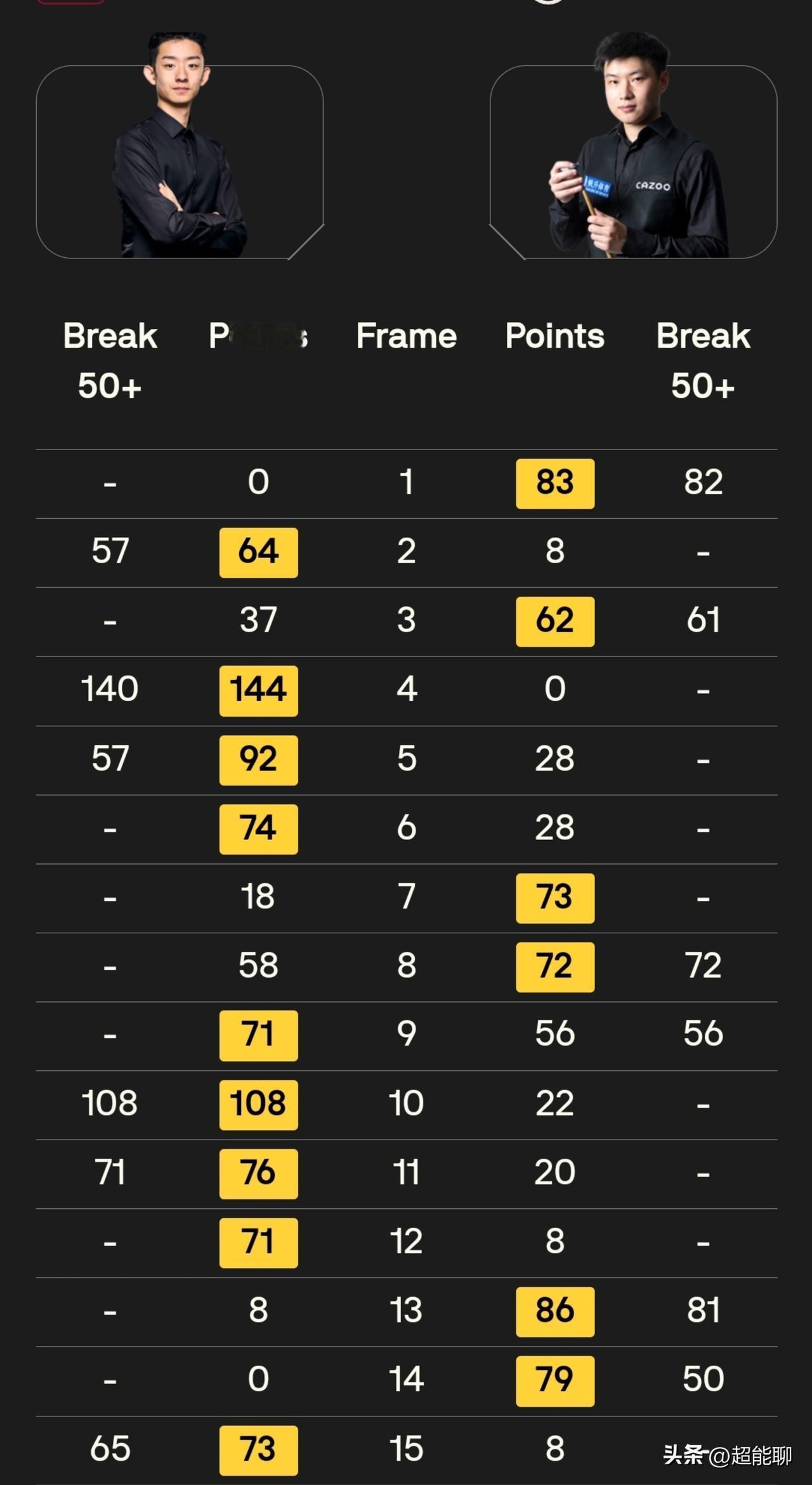 恭喜吴道长9:6赵公子挺进决赛!如果延续这状态大概率要夺首冠了,而赵公子亟待回去好好练练防守了,这次输的不冤。 中国球员按进攻实力来看,目前赵心童、吴宜泽、斯佳辉、常冰玉四人明显比其他人要高一档,这四人也许将是未来很长一段时间里中国斯诺克的牌面。