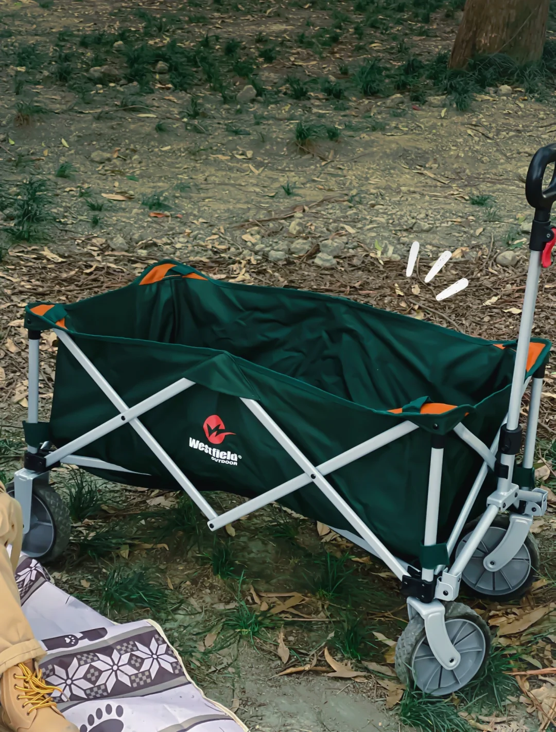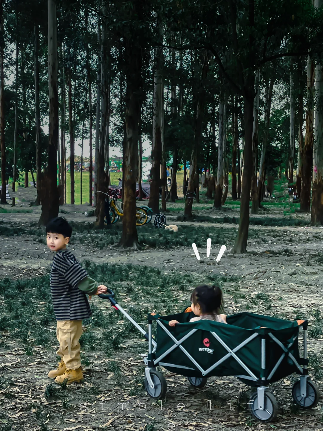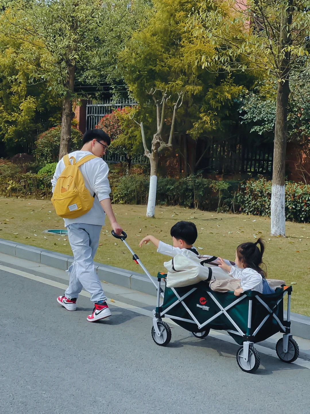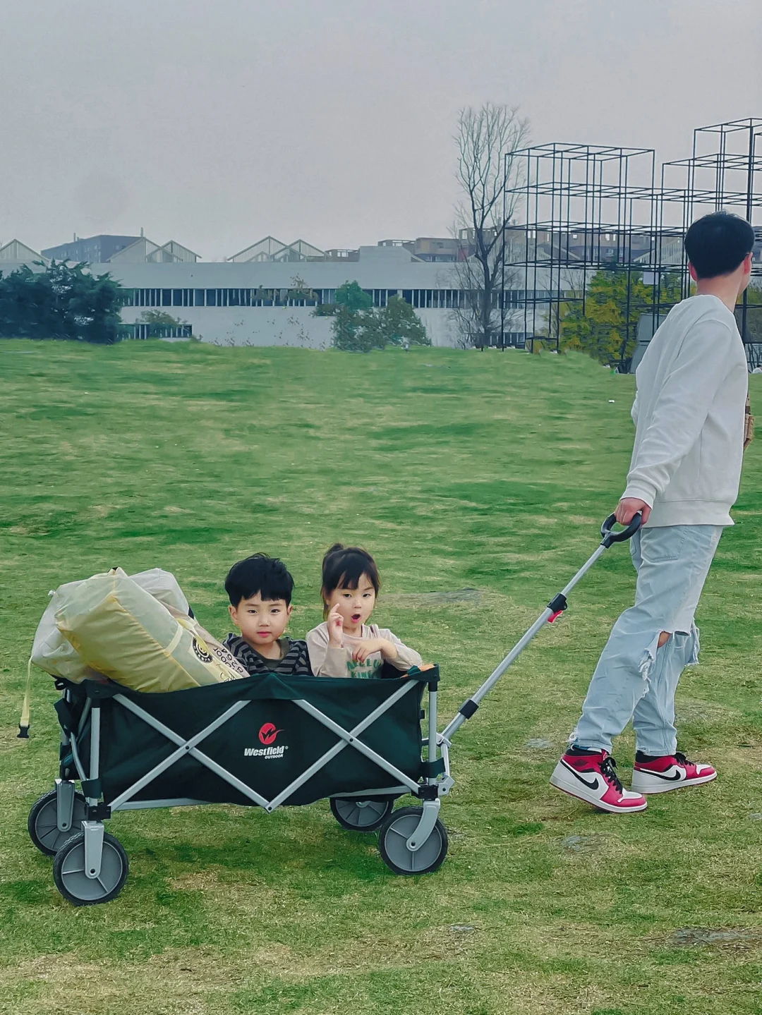 由于停车场在园区大门口的对面,相对来说还有一段距离,我们的装备多而且还带两孩子,所以这次带上了Westfield我飞小绿车,一款性价比超高的露营车,不仅有聚拢收纳的设计放在车里不占空间,而且我不得不佩服它的承载能力和容量,我们一家大大小小的露营装备,还有两孩子都给装下了,简直是解放双手的神器,它的轮子也是360度万向车轮,一路上坑坑洼洼的路面也不受任何影响,孩子们特别喜欢这个车,一直在车里不肯出来,还玩起了你拉我,我拉你的游戏,可太开心了