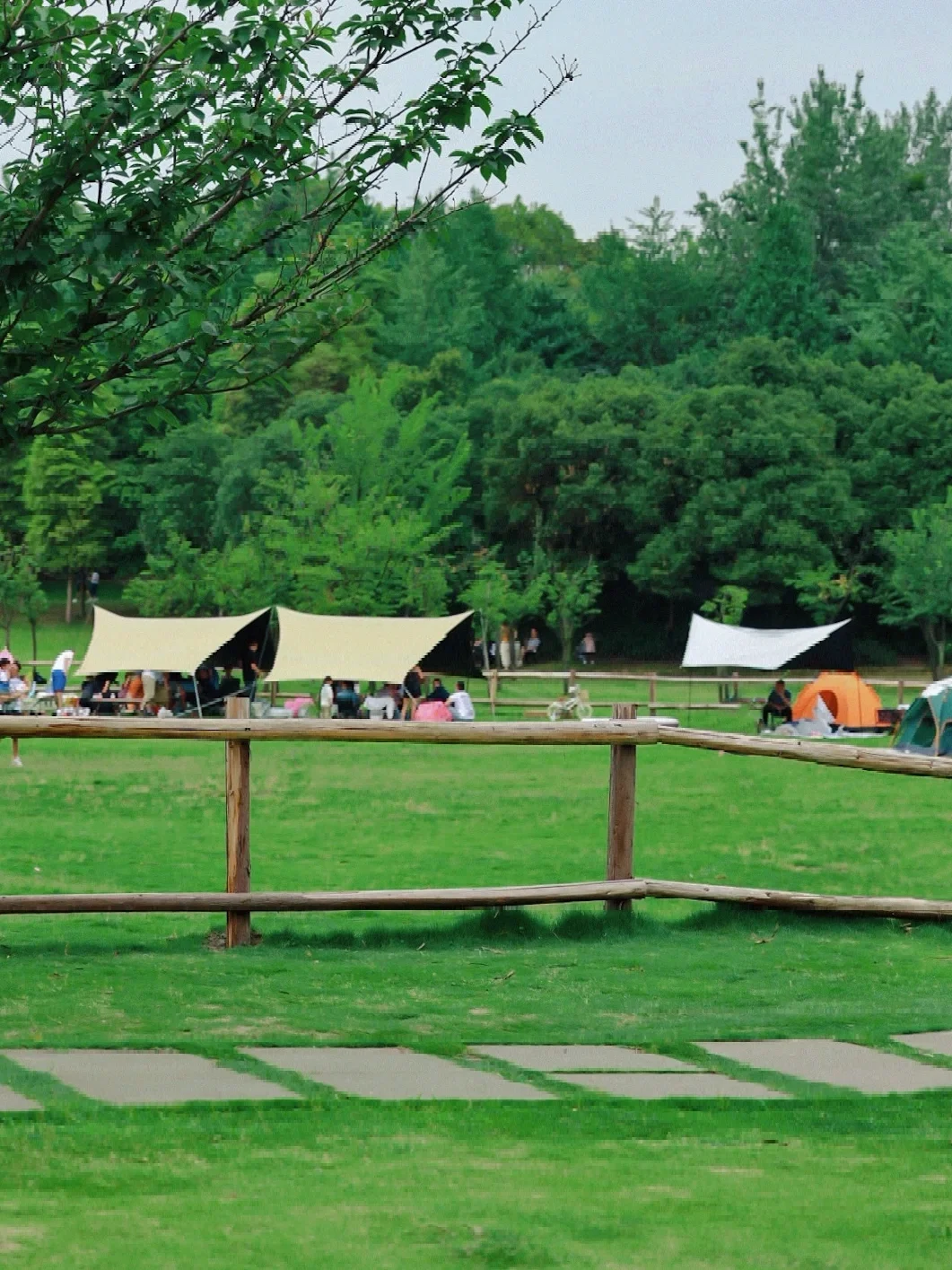 公园分为了草坪区和露营区,草坪上可以铺野餐垫,如果要搭天幕只能在栅栏围着的露营区里面!另一边有一个很大的人工湖泊,可以在湖边的树下野餐或绕湖游玩,整个一圈风景都很美。这里不仅有两颗超出片的夫妻树,还有童话小森林,法式大草坪等,有好多来拍婚纱的,真的随便拍都很美
