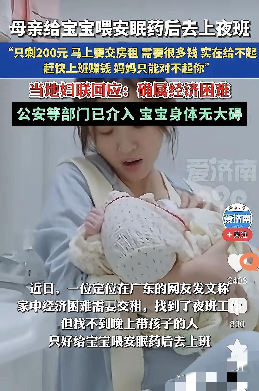 看完广东这位妈妈的经历,瞬间破防了!身上只剩200块要交房租, 独自带娃找不到人照看,竟要靠给孩子喂安眠药才能去上夜班——这哪是选择题,分明是走投无路的绝境! 没人愿意伤害自己的孩子,可当生存压力压得人喘不过气,独自带娃的妈妈连求助的方向都没有,才会做出这种让人心疼的决定 。当地妇联回应了她的经济困难,可现实里,多少单亲妈妈都在经历这种“顾娃就没钱,赚钱就没人看娃”的两难。 所谓的生活不易,从来不是一句空话,而是独自带娃妈妈们要面对的日常。 她们缺的不只是一份工作,更是托育支持、临时帮扶这些能托底的保障。 如果有完善的临时托育或救助渠道,谁愿意用伤害孩子的方式谋生? 你觉得该如何帮这类困境妈妈走出两难?身边有类似的帮扶案例吗?