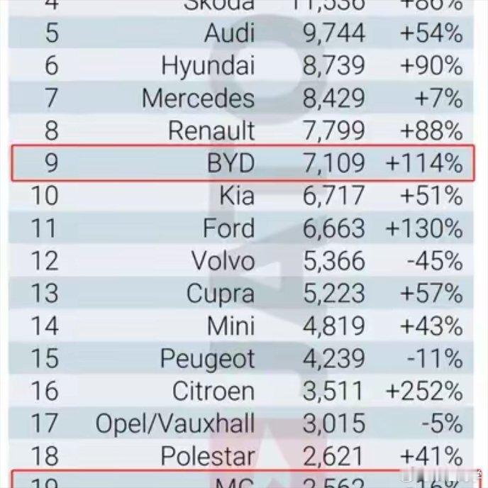 在新能源电车分类中,欧洲人最喜欢的25个新能源品牌里有四家中国品牌上榜,其中比亚迪单月销量7109,同比增长114%,位列第9,MG、零跑、小鹏分别排名19、21、25