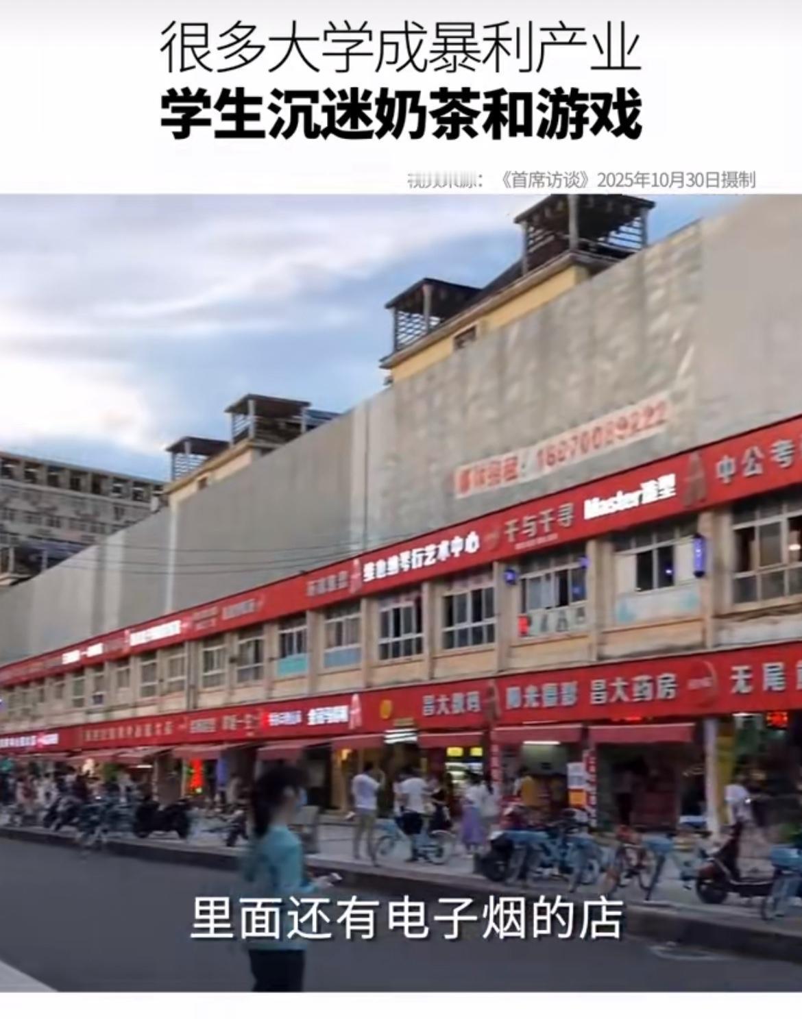 访谈节目谈到把民办大学办成了产业链,一个大学的营收甚至超过一个企业,学校周边都是电影院,奶茶,还有电子烟,学生沉迷于奶茶和游戏,哪有心思学习?民办大学已经不在关注学生的学习,老师们在上面照着课本读,学生们因课程太无聊在下面玩手机,毕业后碌碌无为什么都没有约会,导致找工作没有半点方向