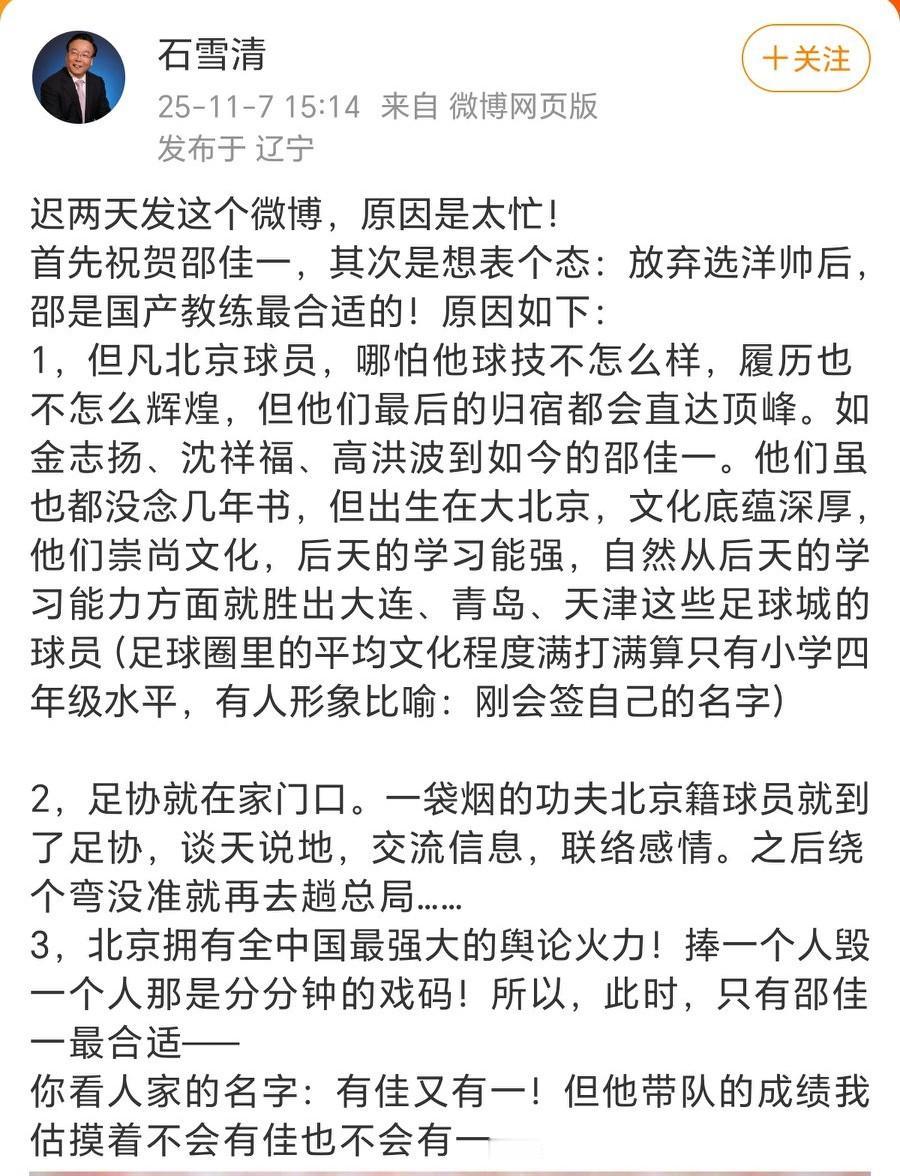 石雪清社媒称:邵佳一当选国足主帅是因为圈子,但凡北京球员,哪怕他球技不怎么样,履历也不怎么辉煌,但他们最后的归宿都会直达顶峰。如金志扬、沈祥福、高洪波到如今的邵佳一。 而且,足球经理人石雪清还断言,邵佳一带国足成绩,恐怕没有佳也没有一。 随后,知名足球媒体人徐江怒批了石雪清,说他是被好几个俱乐部扫地出门的,别阴阳邵佳一。 国足选帅时,多数媒体人都表示必须是外教,洋帅,但是自从宣布是邵佳一后,几乎所有足球媒体人画风都变了,现在都是一股脑的支持。不过也没办法,现在能做的,包括球迷能做的,就是支持。 中国足球圈子,挺有意思,圈子文化也是独树一帜。邵佳一出任国足主帅 国足