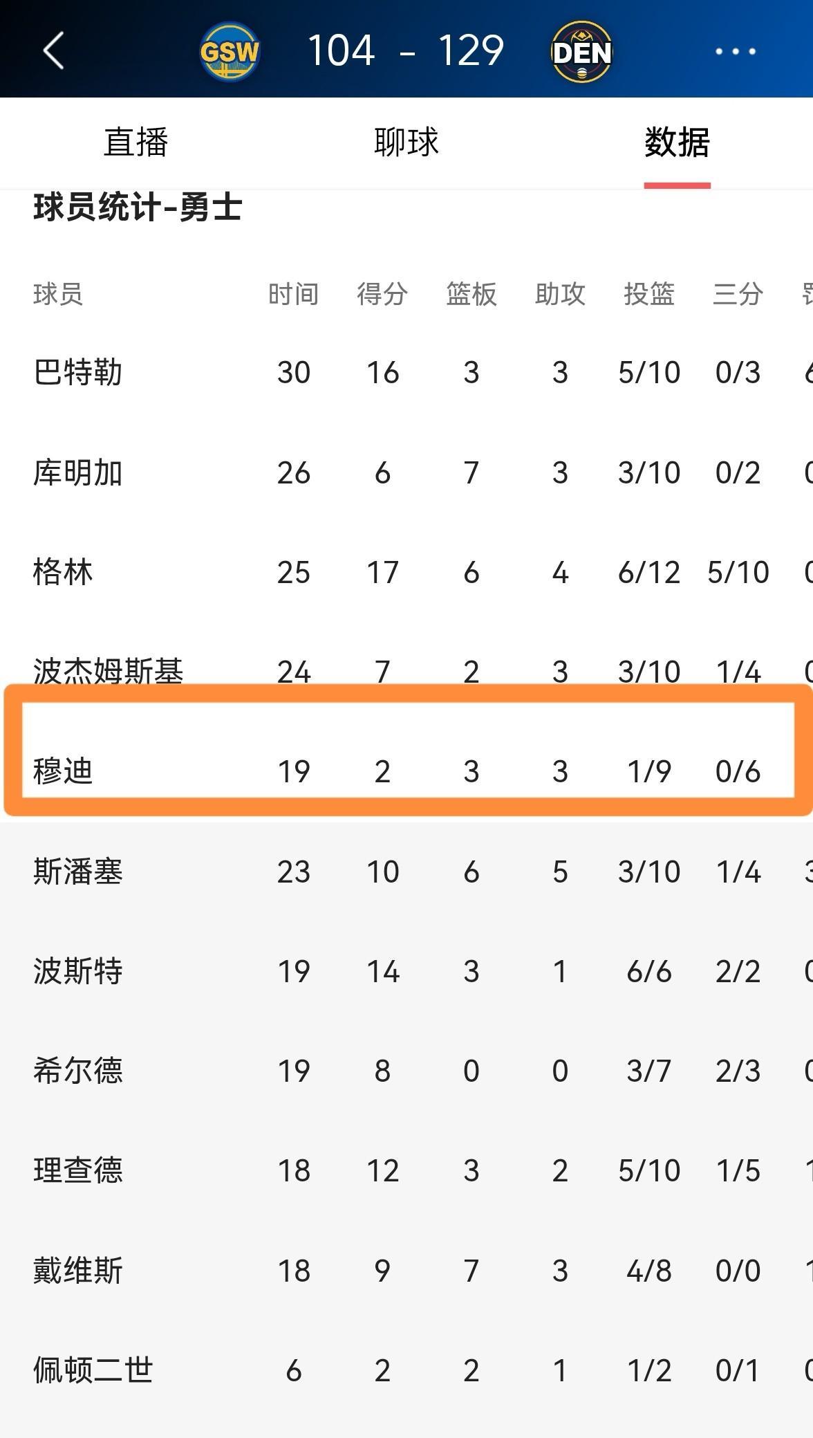 勇士新星穆迪真是彻底的迷失了自我!在今天勇士客场以104:129惨败于掘金的比赛中,穆迪的投篮手感冰凉到了极点,全场比赛下来,穆迪首发出战19分钟,投篮9中1,其中三分球6中0无比低效的得到2分,他的场上正负值为-9。 本场比赛对于穆迪来说真是特别的苦涩,因为他打了一场灾难性的比赛,如果他在以后的比赛中无法及时的苏醒,那么他将会失去科尔教练的信任。