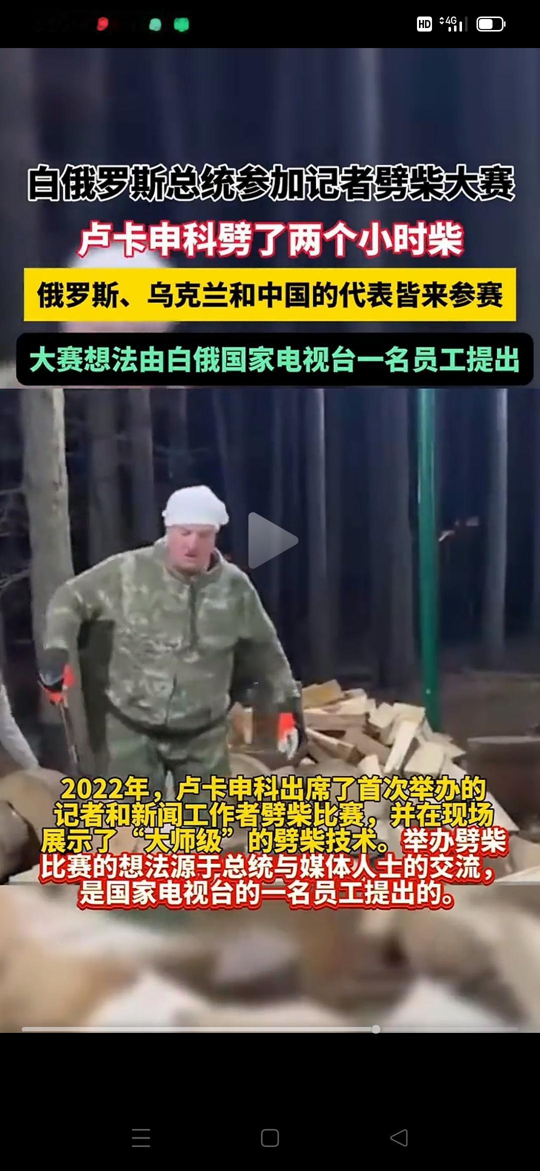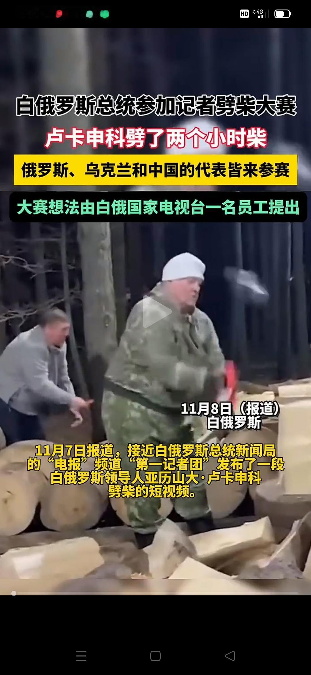 71岁总统还能现场劈柴两小时,让人佩服,更佩服他对华友好始终如一! 据报道,11月7日,白俄罗斯总统卢卡申科当天在明斯克州参加第四届记者及新闻工作者劈柴大赛,现场劈柴两小时,以此声援参赛选手 。 卢卡申科出生在白俄罗斯农民家庭,年轻时在苏军当过兵,71岁了,身体还这么硬朗,我周围70岁左右的人可没这么厉害。 他有很强的执政能力,1994年开始当白俄罗斯总统,一当就当七任,一干就当31年,是全球执政时间最长的国家元首之一。这么多年来,他对中国人民的友好感情,始终如一! 白俄罗斯 卢卡申科