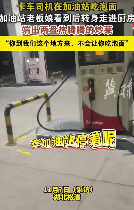 “这老板娘太善良了!”湖北松滋,卡车司机在加油站吃泡面。没想到,老板娘看到后,转身进厨房炒菜,然后端出两盘热腾腾的炒菜给他加菜。老板娘对他说: “你到我们这个地方来,不会让你吃泡面。” 原来,这天晚上,男子开着卡车来到湖北松滋市254省道附近装货。他在附近找了一处加油站准备停车休息,而他有些饿了,但是附近偏僻,没有饭店。只有一个小商店,于是他去买了一桶泡面,然后去加油站接开水。 男子端着泡面正准备接水,这时加油站老板娘走了过来,看了看他手里端的泡面。然后老板娘问男子: “这么大的车,你一个人跑运输吗?”男子说: “是啊,一个人跑,现在跑运输基本上都是一个人。” 老板娘就说: “你们也挺不容易的。”男子说: “都是为了生活。”老板娘又跟男子说: “你不要吃泡面了,我去厨房给你做点饭。” 男子赶忙说: “不用了,太谢谢了,您让我把车停在加油站外边,我就非常感谢了。” 因为男子这辆车比较长,而他在附近装散货,没地方停车,就停到加油站这边了,但是这个加油站不大,但他的车太长。 因此他的车往这一停,就导致只给加油站留了一个进出口。 所以老板娘能让他把车停这边,他心里就很感激了。 结果老板娘说: “你们跑运输的挺不容易的,遇到了,我就会帮一把,我去给做点饭,你不要嫌弃。”男子立马说: “没有,就是太给你添麻烦了。”而老板娘说: “添啥麻烦,来我们这,不会让你吃泡面。” 老板娘说着就进了加油站厨房,然后炒了两个菜,端出来摆在桌上,冒着热腾腾的气。 这一幕也让网友们夸赞这位老板娘人美心善。 有网友说: 第一回在网上刷到外地货车司机在我们松滋装货的视频。别的不说,松滋有句话“松滋人礼性大”。 也有网友说: 我们松滋人都是很好客的,欢迎来到松滋,我就是这个加油站附近的,这位老板娘人很不错,相当好客。 还有网友说: 我始终相信这世上还是好人多,希望司机师傅也能将这份爱心传递下去。 这一幕太暖了,而这段视频背后,藏着的是卡车司机们的日常。他们日夜兼程,风餐露宿,泡面则是驾驶室里的“标配”。 这一碗泡面,承载的是无数个无法按时吃饭的日夜,是服务区里短暂的喘息。 像加油站老板娘的这个举动,看似平凡,但却闪耀着不平凡的人性光辉。 这也是对劳动者最朴素的尊重,她读懂了泡面背后的艰辛,用行动告诉每一个奔波在路上的劳动者,你的付出,有人看见。 同时,这还是刻在中国人骨子里的待客之道。 “有朋自远方来”,哪怕只是一位匆匆过客,也要以诚相待。 在这个人人步履匆匆的时代,她愿意为一个陌生人停下脚步,生火做饭,这份不经意的善意,重建了人与人之间的信任。 老板娘的厨房里炒出的不只是菜肴,更是冬日里的一把火,它温暖的不只是一位司机的胃,更是温暖了整个社会的良心。 最后,老板娘端出的这两盘热腾腾的菜告诉我们,再平凡的日子,也值得被温柔以待;再普通的人生,也配得上热气腾腾的关怀,给这位人美心善的老板娘点赞。 (来源: 冀时)