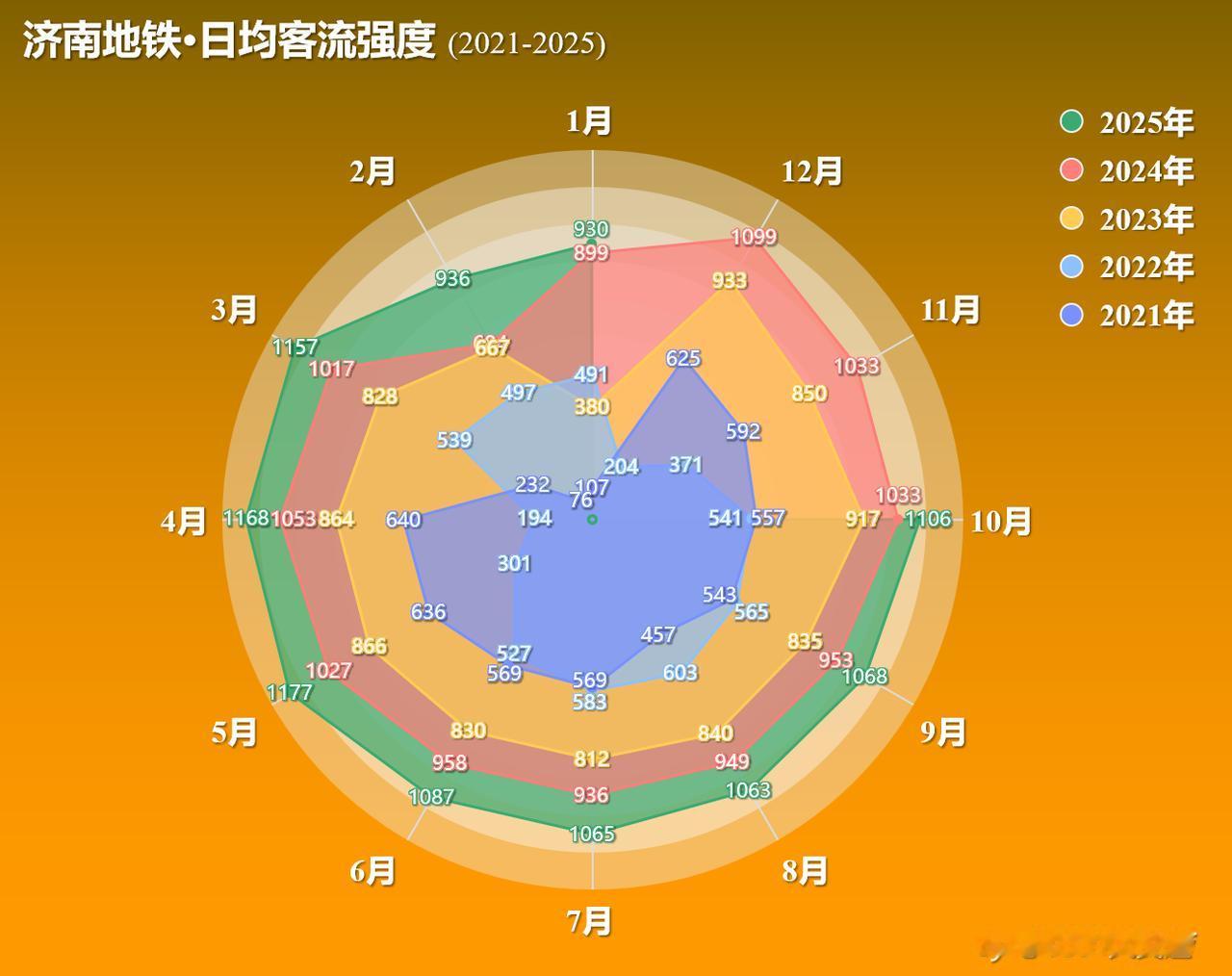 2025年10月济南地铁完成旅客运输量1105.5w人次,同比增长7.04%;日均客流35.66w人次,环比9月略增0.16%;客流强度0.37万人每日每公里,同比下降6.91%[思考][思考]。客流数据谈不上优秀,但考虑到受国庆期间连续降雨影响,黄金周8天济南地铁旅客发送量仅257.6w人次,算下来10.9-10.31期间济南地铁的日均客流达到了36.8w人次,算是超出预期了[无辜笑][无辜笑]。由于2024年11月济南地铁3号线2期开通拉低了全网客流强度,济南地铁日均客流强度在近12个月几乎一直处于同比降低的状态,11月济南地铁的客流强度能否实现正增长呢?[大笑][大笑]这主要取决于济南地铁11月有没有新线开通!作为2025年全球新增轨道交通里程最多的城市,济南地铁在11-12月间将密集开通5条轨交新线[奸笑][奸笑],从试运行时间来看,依次为高新云巴【8.7试运行】、地铁6号线【8.26试运行】、地铁4号线【8.31试运行】、地铁8号线【8.31试运行】、有轨电车济阳线【9.15试运行】[吃瓜群众][吃瓜群众]。目前高新云巴试运行已达3个月,有传言称暂定12月初开行,当然即使能够提前到11月,按照交通运输部的标准,云巴并不计入轨道里程[机智][机智];此前的线路来看,地铁2号线和3号线基本都是试运行3个月零一两天就正式开通,但地铁成网后开通的3号线二期,在试运行3个月零十天左右才开通,所以尽管地铁4/6/8号线均可在11月底完成3个月试运行的期限,但4/8号线显然来不及在11.30开通,6号线能赶在11月底开通的可能性也极低[狗头][狗头]。因此11月大概率还是济南地铁三线时代的最后一个完整月,预计旅客运送量1070w人次左右