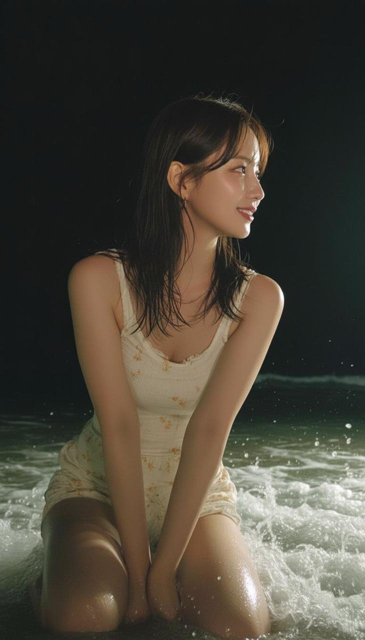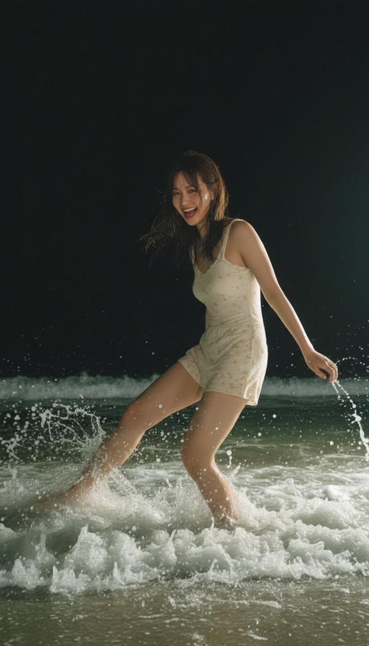 夜色漫上海滩时, 她像被月光吻醒的潮汐精灵——米白碎花裙被浪花浸得半透, 贴着纤细腰肢轻晃;湿发垂落肩头, 水珠顺着锁骨滑进衣领, 在微光里碎成星子。她赤脚踩在浪尖, 笑眼弯成月牙, 唇角扬起的弧度里藏着海风与星子的私语,连裙摆翻涌的褶皱都浸着晚风的甜。