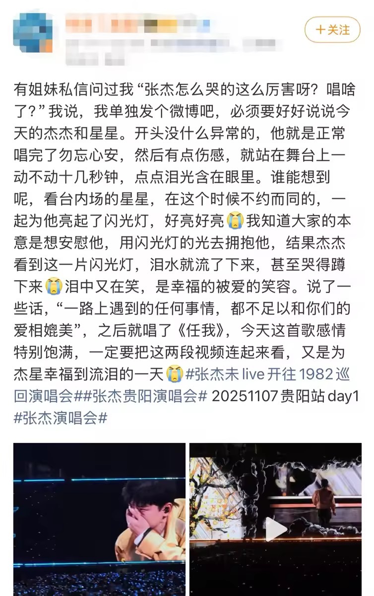 张杰演唱会2分钟的不语张杰演唱会现场哭了😭真的非粉也忍不住心疼的程度,那么坚强的杰哥,看到粉丝给予的爱意,忍不住泪目真的好好哭[泪]