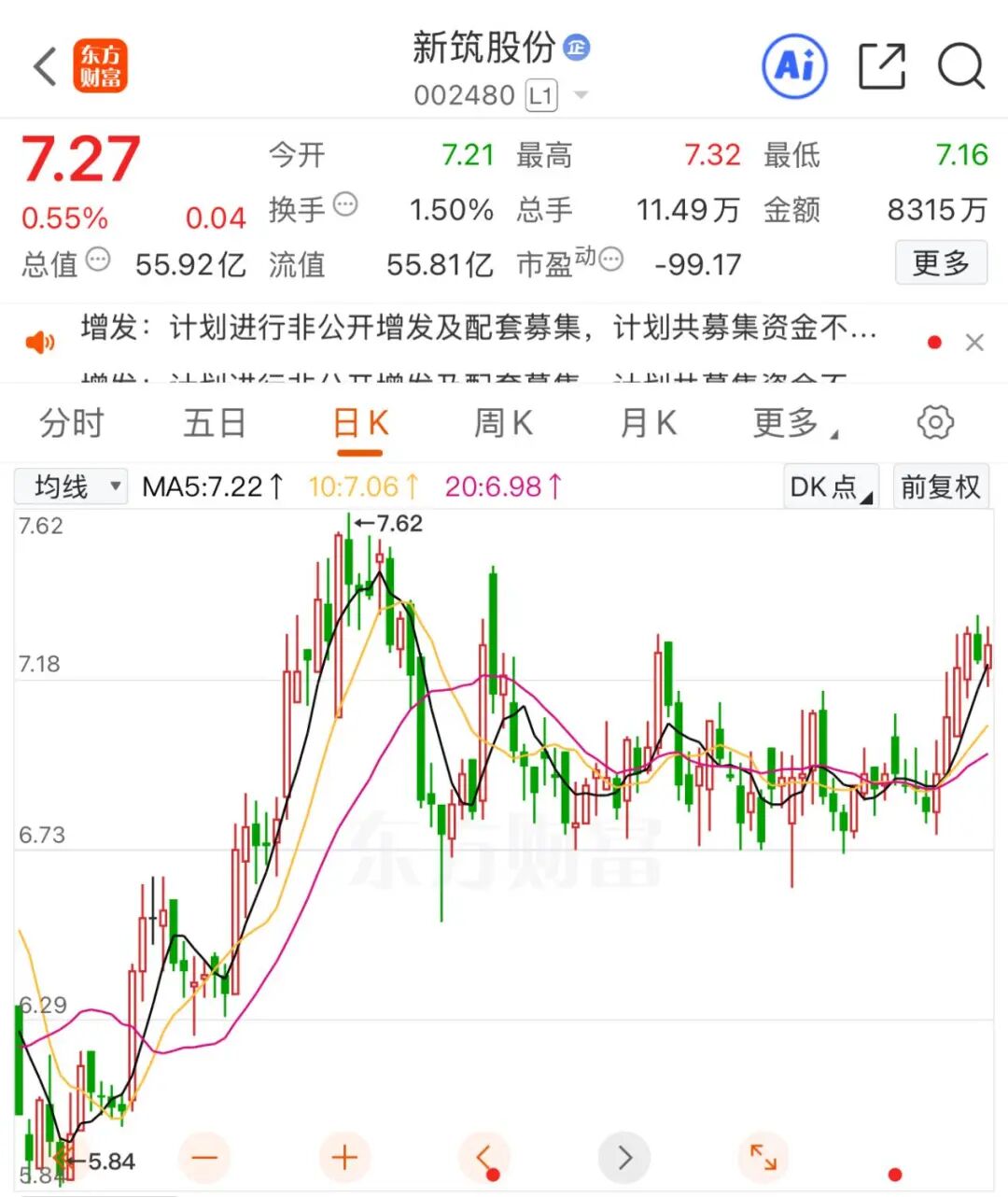 截至11月7日收盘,新筑股份报7.27元/股,最新市值为55.92亿元。
