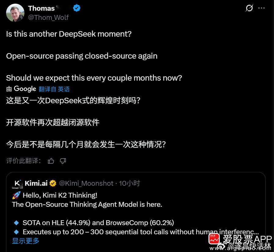 11月6日,月之暗面公告称,发布Kimi K2 Thinking,我们最强的开源思考模型。作为一款开源模型,它在基准测试上毫无保留,多方面性能直接超越了GPT-5、Claude Sonnet 4.5等业界先进闭源模型。HuggingFace联合创始人置评Kimi K2 Thinking称,我们正在见证又一次DeepSeek时刻,开源软件再次超越闭源软件。