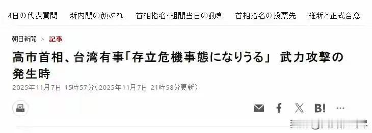 中方已给过机会,高市早苗再踩台海“红线”,公开确认武力介入 据《朝日新闻》报道, 当高市早苗被问及所谓“台湾有事”是否构成日本可依据安全保障法行使“集体自卫权”的“存亡危机事态”时,高市早苗表示,如果台海出现了涉及使用战舰并伴随使用武力的情况,她认为这可以被视为“日本危机存亡事态”,届时自卫队可能会行使“集体自卫权”。 “这是公然踩红线!”日本首相高市早苗的一番狂言,让本就敏感的台海局势再添紧张。竞选时打着“温和保守”旗号赢得支持,上任后却接连暴露真实立场,11月7日在众议院预算委员会听证会上,她更是直接突破底线,明确表态台海若出现涉及战舰与武力的情况,将被视为日本的“存亡危机事态”,自卫队可能据此行使“集体自卫权”——这番赤裸裸的武力介入宣言,彻底撕下了伪装,也无视了中方此前多次释放的缓和信号。 集体自卫权的本质,是当亲密盟国遭受武力攻击时,即便本国未被直接攻击,也可动用武力援助,这一权利的滥用,早已成为地区和平的潜在威胁。高市早苗此番言论,并非一时冲动的随口表态,而是日本近期一系列军事动作的明确延续。 此前已有消息披露,美日正计划在12月制订首份“应对台海紧急事态”的联合作战计划,美军拟在日本西南诸岛及菲律宾部署配备“海马斯”火箭炮的导弹部队,并设立临时军事基地,而日本自卫队将负责提供弹药、燃料等后勤支援,形成完整的军事介入链条。 高市早苗的表态,相当于给这一危险计划贴上了官方标签。要知道,台湾问题是中国内政,这是国际社会公认的事实,无论从历史经纬还是法理依据来看,都与日本没有任何关联。 所谓“存亡危机事态”的说法,完全是牵强附会的借口,其核心目的就是借着美日同盟的框架,深度介入台海事务,遏制中国发展。这种将内政问题与地区安全捆绑的做法,严重违反国际法基本原则,也彻底暴露了日本试图借台海问题扩张军事影响力的真实野心。 值得注意的是,此前中日关系已出现缓和迹象,两国恢复了多项搁置已久的双边磋商,中方也始终保持着沟通的诚意,希望通过对话管控分歧。但高市早苗的言论,无疑是对这份诚意的公然践踏。 她上任后,日本在军事扩张的道路上越走越远,不仅大幅增加国防预算,还在西南诸岛加紧部署军事设施,与美国、菲律宾的军事勾连也日趋紧密,形成了“台湾问题与南海问题联动”的危险态势——菲律宾在台湾问题上为美日提供便利,美日则在南海问题上支持菲律宾的挑衅主张,三方互相配合,搅动地区局势。 军事专家分析,高市早苗此时抛出这番言论,背后有多重考量。一方面是迎合美国的亚太战略,通过强化美日同盟巩固自身政治地位;另一方面,也是想借外部局势转移国内矛盾,用“安全危机”的论调争取保守派支持。 但这种不计后果的冒险行为,注定会反噬自身。日本作为二战战败国,本应恪守和平宪法,约束军事力量发展,可如今却频频突破限制,主动卷入地缘冲突,无疑会让周边国家高度警惕,也让日本民众陷入战争风险之中。 中方早已明确表态,坚决反对任何国家以台湾问题为借口强化军事部署、挑动对抗。台湾问题事关中国核心利益,任何企图分裂自己国家的行为,都将遭到中国人民的坚决反对,任何外部势力的干涉,都无法阻挡中国统一的历史进程。高市早苗的言论,本质上是在为“台独”分子撑腰打气,只会加剧台海紧张局势,破坏地区和平稳定。 高市早苗的危险言论,再次给国际社会敲响了警钟。历史已经证明,军事扩张和外部干涉只会带来灾难,维护地区和平稳定,需要的是尊重各国主权和领土完整,而不是拉帮结派、制造对立。中方的克制不是软弱,沟通的诚意也不是可被拿捏的把柄,任何触碰台海红线的行为,都将遭到坚决反制。 如今,高市早苗的言论已引发全网热议,国际社会纷纷关注日本的危险动向。在和平与发展成为时代主题的今天,逆势而为的军事介入图谋,注定不会得逞。如何回到对话协商的轨道,放弃危险的军事扩张计划,是日本政府必须正视的课题。 对此,你们有什么看法,欢迎评论留言~