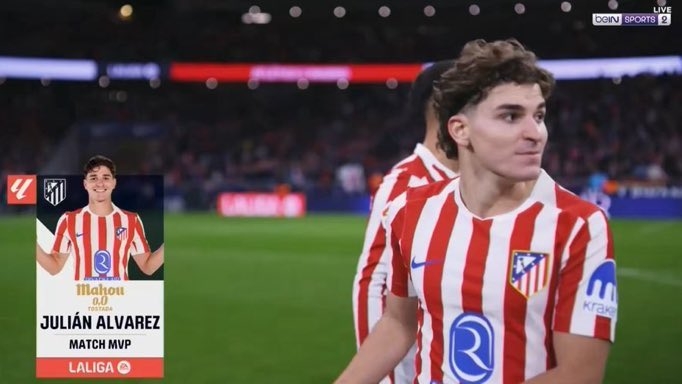 直播吧11月9日讯马竞在本轮西甲3-1击败莱万特,西甲官方在赛后将没有直接参与进球的阿尔瓦雷斯评选为本场MVP。