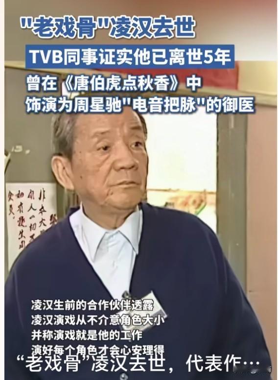 谁能想到,《唐伯虎点秋香》里给星爷把脉的搞笑御医,已经悄悄离开我们五年了?TVB老戏骨凌汉的死讯刚被证实,这份迟来的告别真的戳中了太多人。 他一辈子演了200多部作品,从铁木真这样的大人物到街坊看更,甚至一部剧里一人分饰五角,却始终甘当绿叶。最让人动容的是他的态度,一句“演戏是工作,做好就心安”,道尽了老辈演员的纯粹。 可这样一位用演技填满港剧黄金时代的人,离世五年才被知晓,连句正式告别都没有,实在让人唏嘘。这哪里是他的遗憾,分明是行业对“无名戏骨”的亏欠——我们记得经典角色,却常常忘了背后默默坚守的他们。 那些陪伴我们长大的“熟面孔”正在慢慢远去,你对凌汉最深刻的记忆是哪个角色?来评论区聊聊~