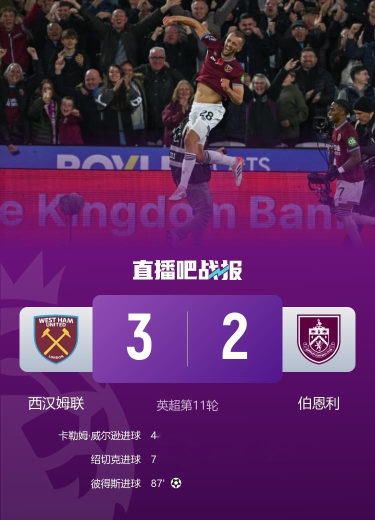 西汉姆本轮3-2惊险击败伯恩利,西汉姆在经过此前低迷后久违地拿下两连胜。