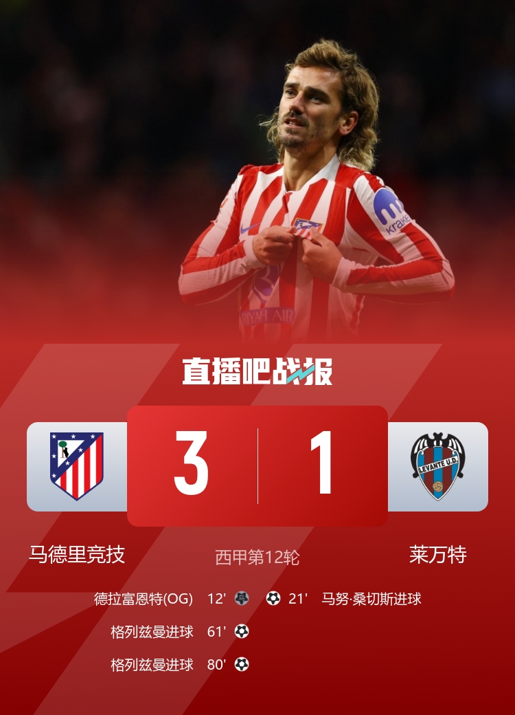 马竞本轮3-1击败莱万特,格列兹曼替补两球成为取胜功臣。