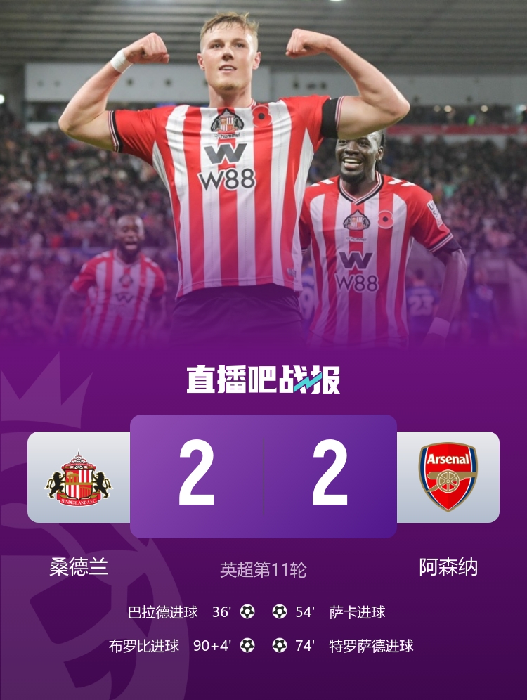 阿森纳本轮2-2战平桑德兰,布罗比补时绝平,阿森纳的连胜和零封纪录都终结了!