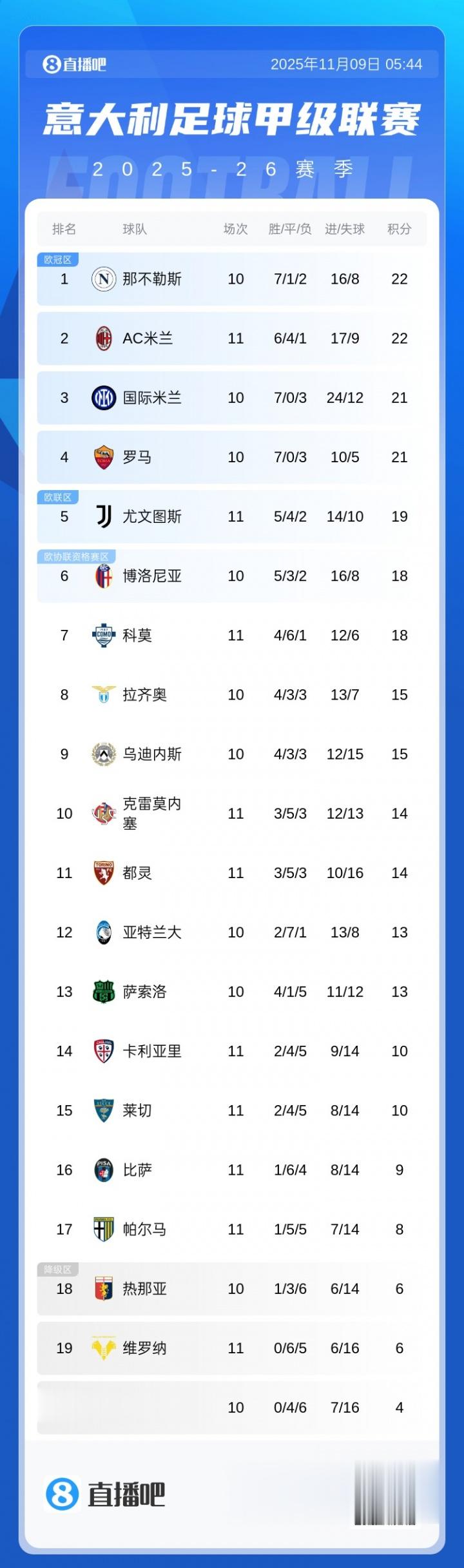 意甲积分榜:米兰先赛积分追平那不勒斯,国米、罗马同积21分