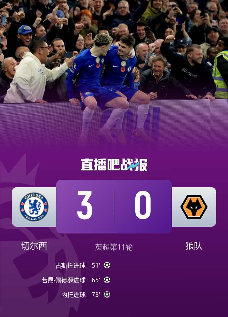 切尔西本轮3-0轻取狼队,蓝军方面古斯托、佩德罗和内托进球,切尔西此役后暂升第2。