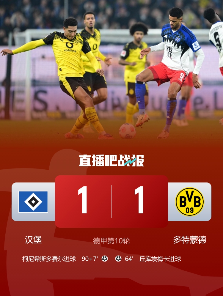 97分钟遭绝平!多特1-1客平汉堡丘库埃梅卡破门施洛特贝克献助攻