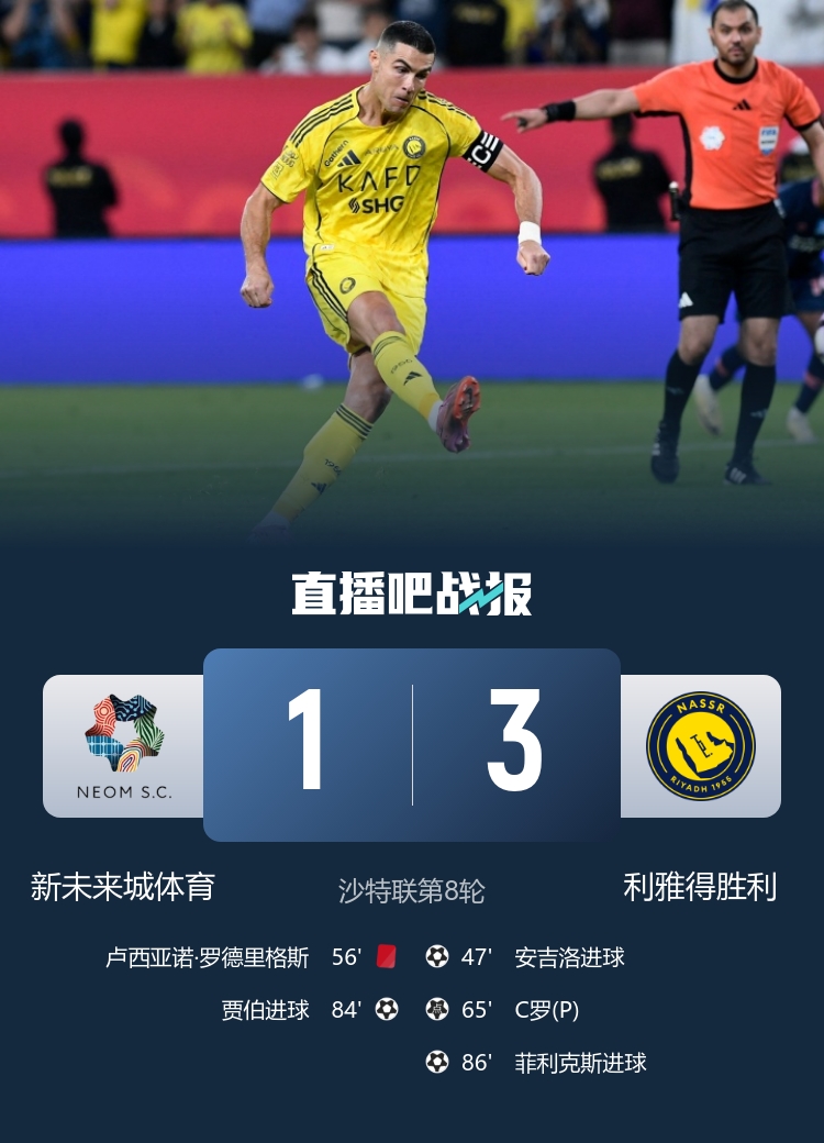 本轮沙特联,利雅得胜利3-1击败新未来城体育,C罗、菲利克斯和安吉洛破门。