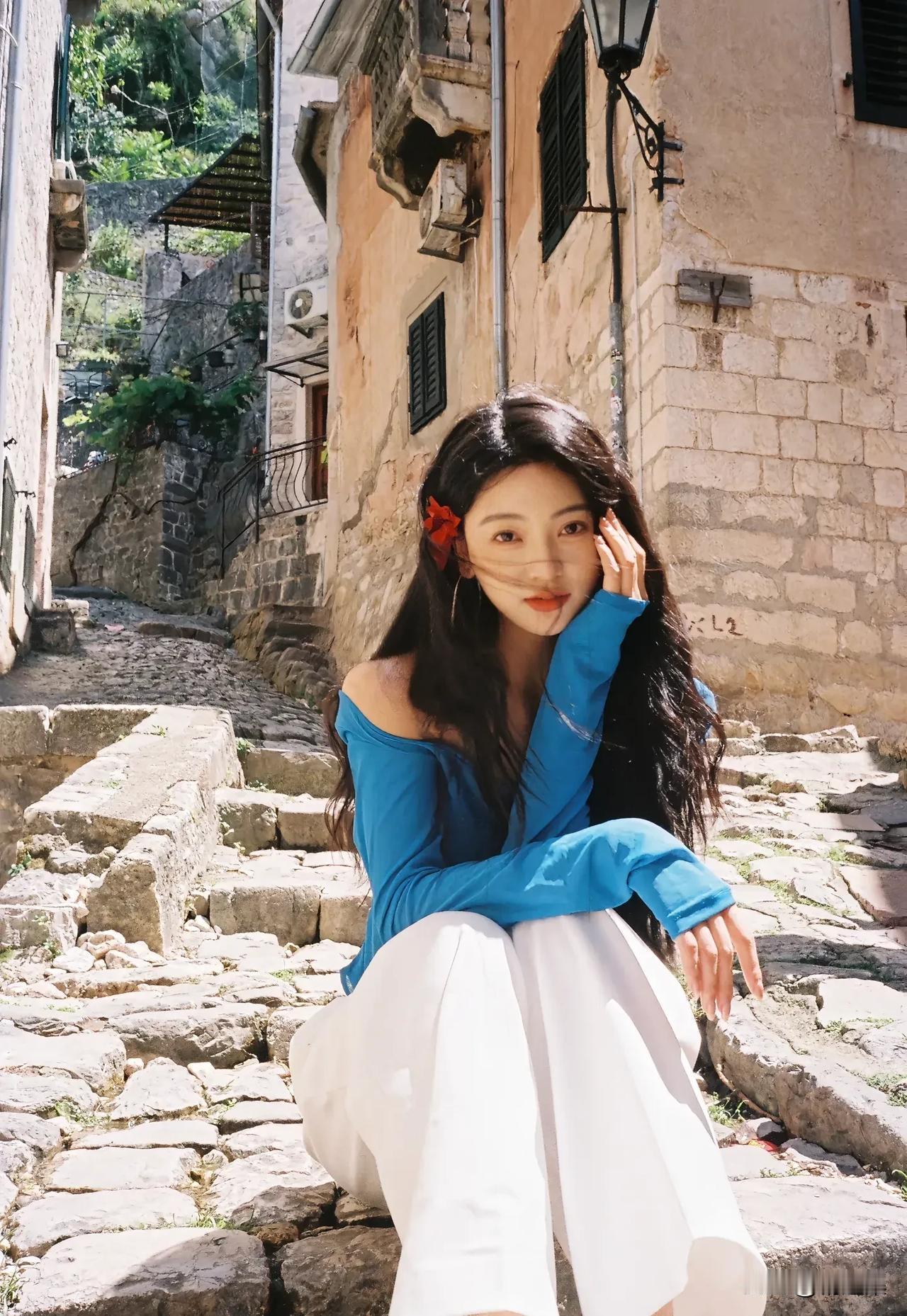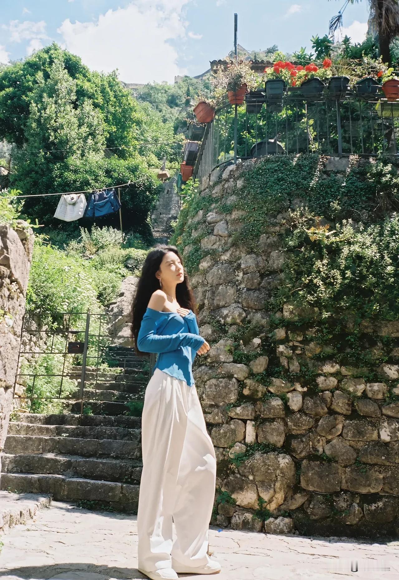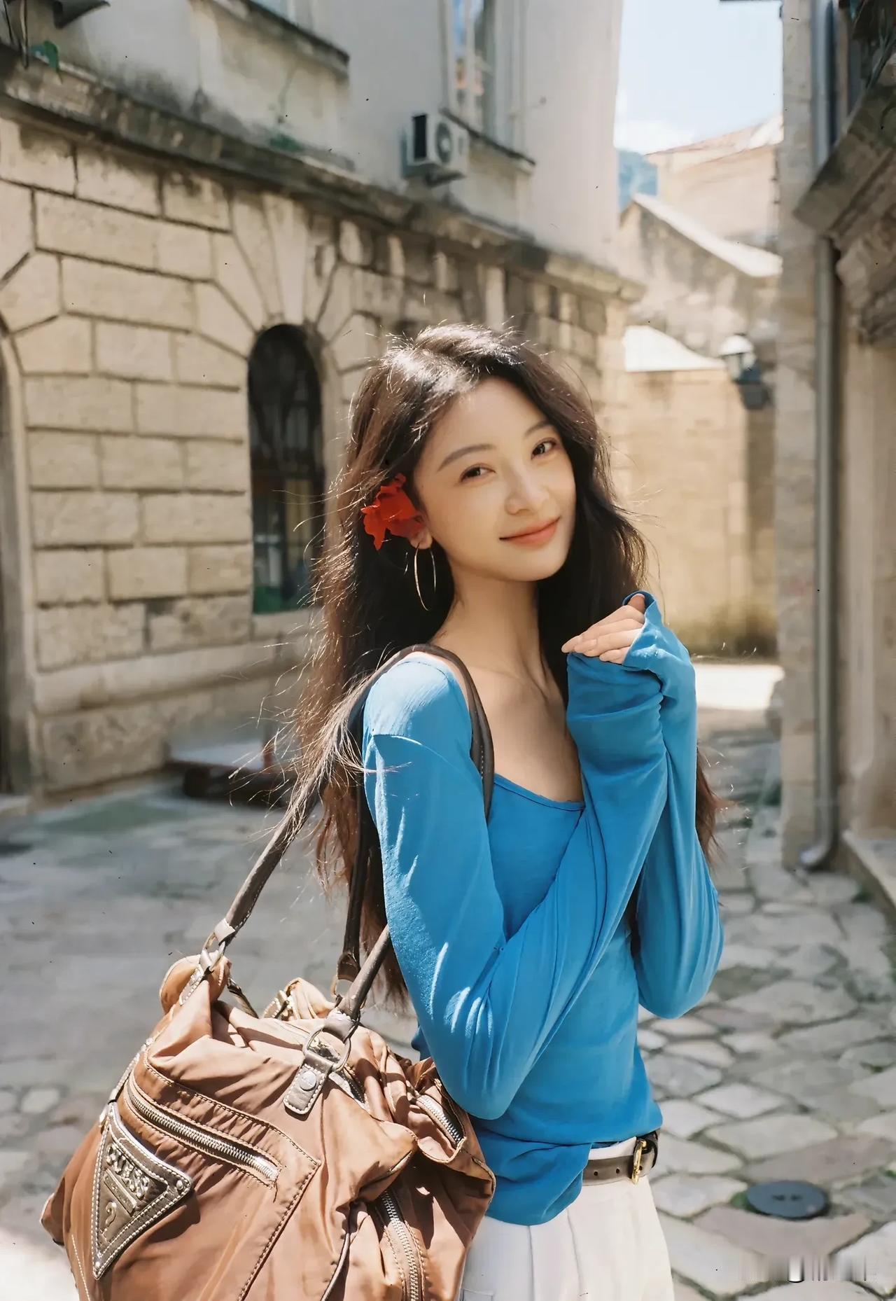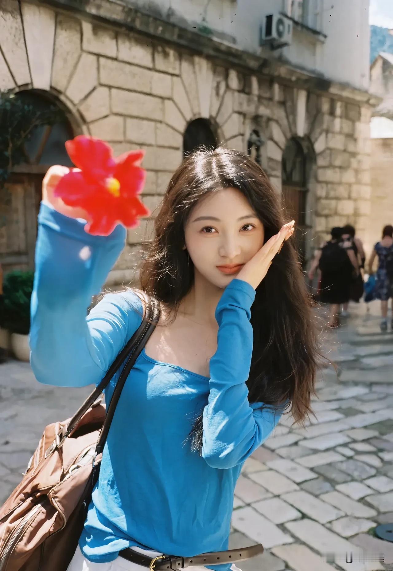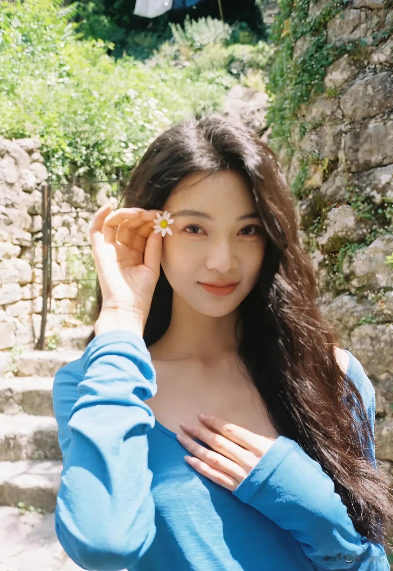 阳光下的花与少女,自然与美好的瞬间。