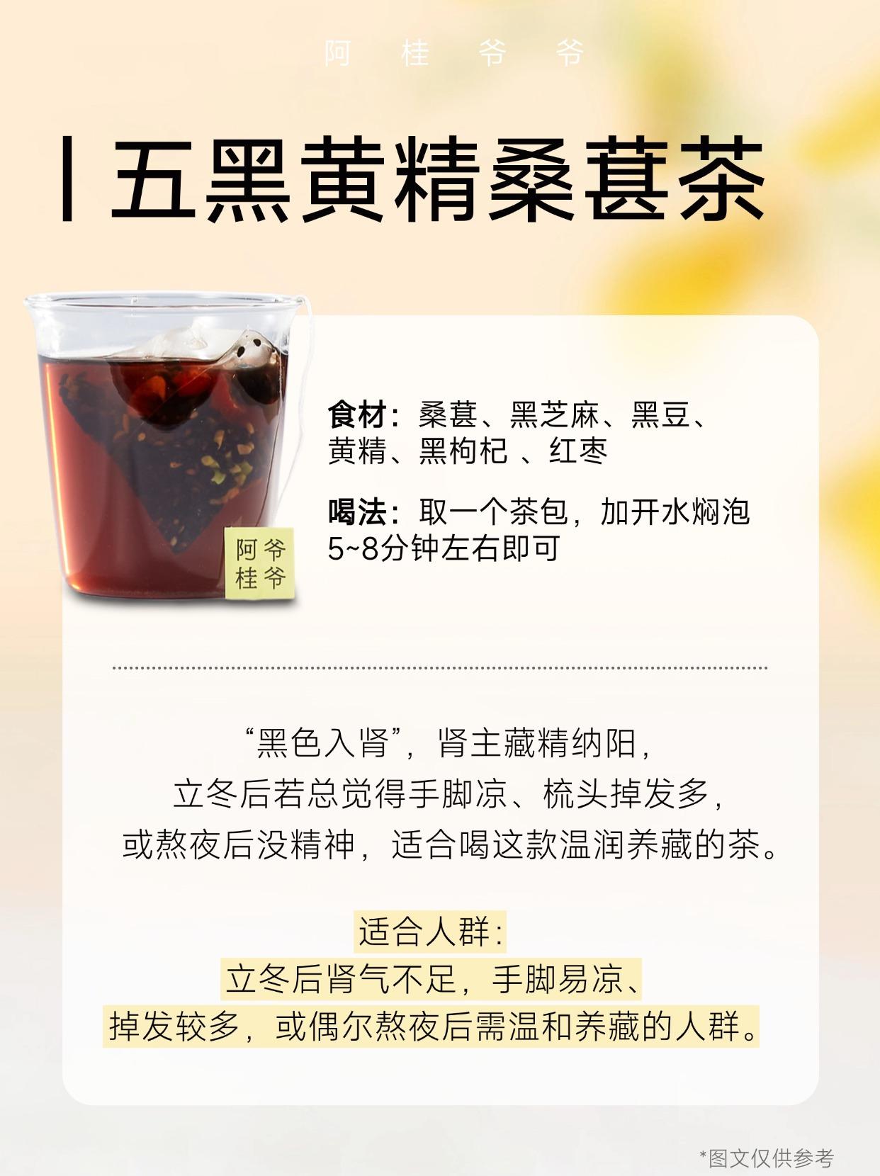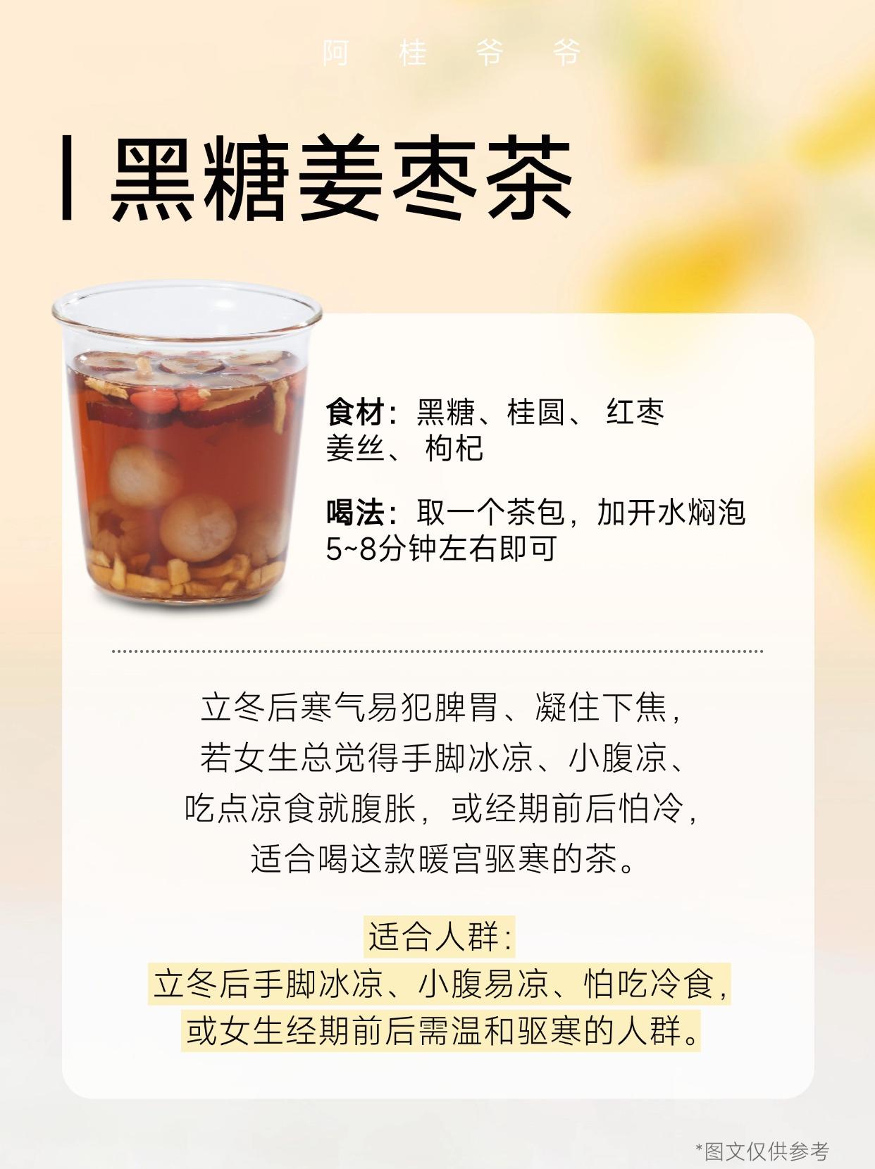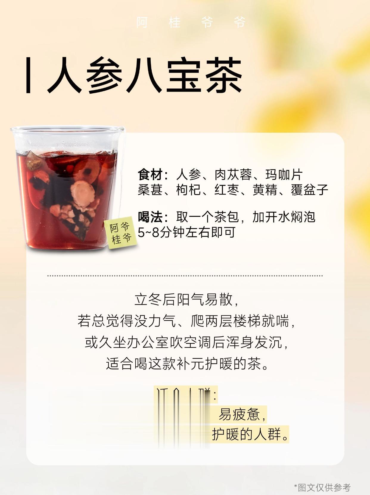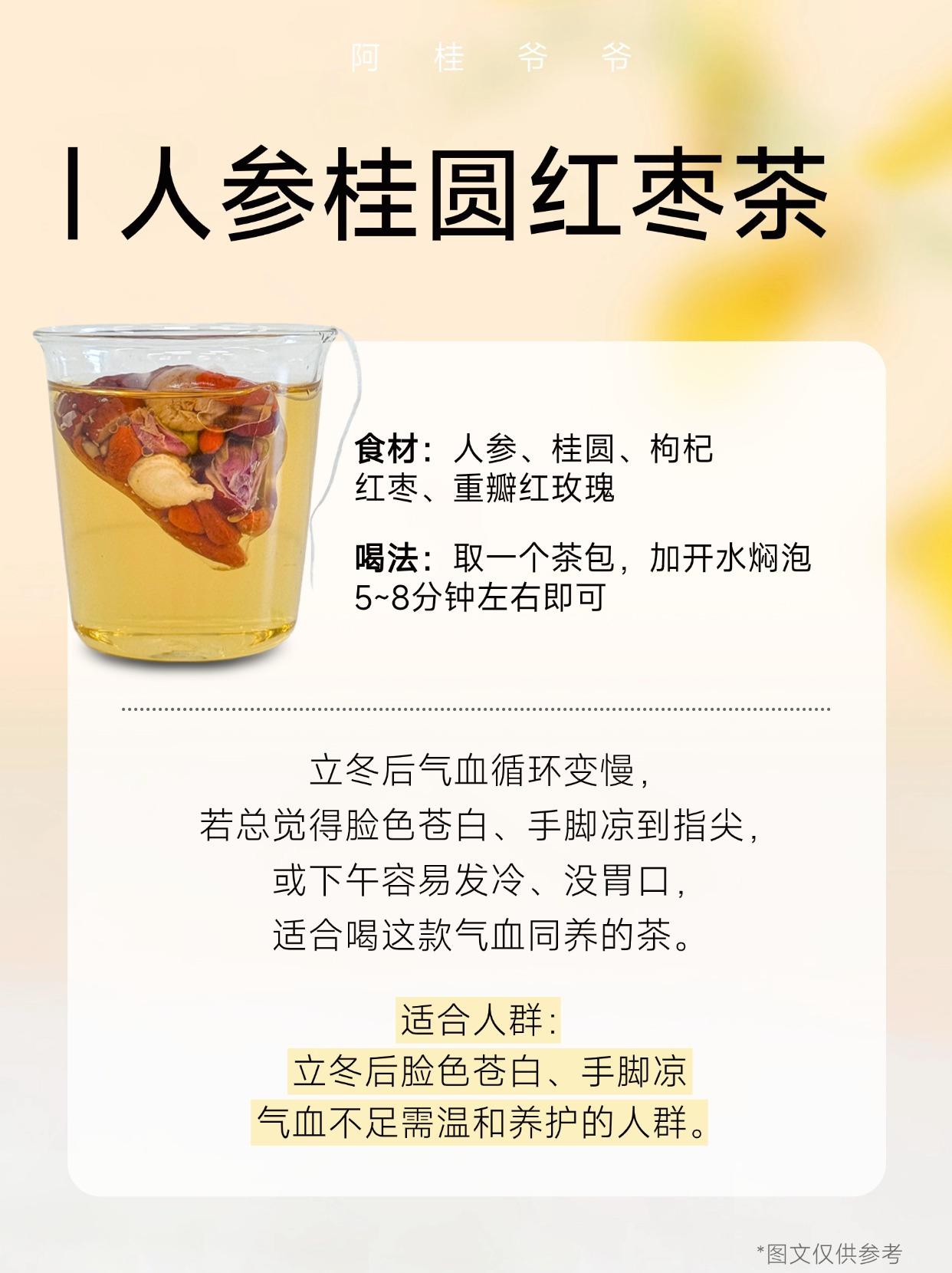立冬后藏阳护暖,码住这4款养生茶。寒风至,立冬来。 立冬一到,天气骤冷,总觉得手脚凉到半夜、身上没力气, 稍不注意就被寒气 “钻空子”,这时养生关键在 “藏阳护暖”。 分享4款适合立冬后喝的养生茶饮,宝子们可根据需求选择, 慢慢把阳气藏好,冬天也能暖乎乎的~ 1、五黑黄精桑葚茶——适合肾气不足 食材:桑葚、黑芝麻、黑豆、黄精、黑枸杞 、红枣 2、人参八宝茶——适合男/女士养阳 食材:人参、肉苁蓉(沙漠)、玛咖片、桑葚、枸杞、红枣、黄精、覆盆子 3、黑糖姜枣茶——适合手脚冰凉 食材:黑糖、桂圆、 红枣、 姜