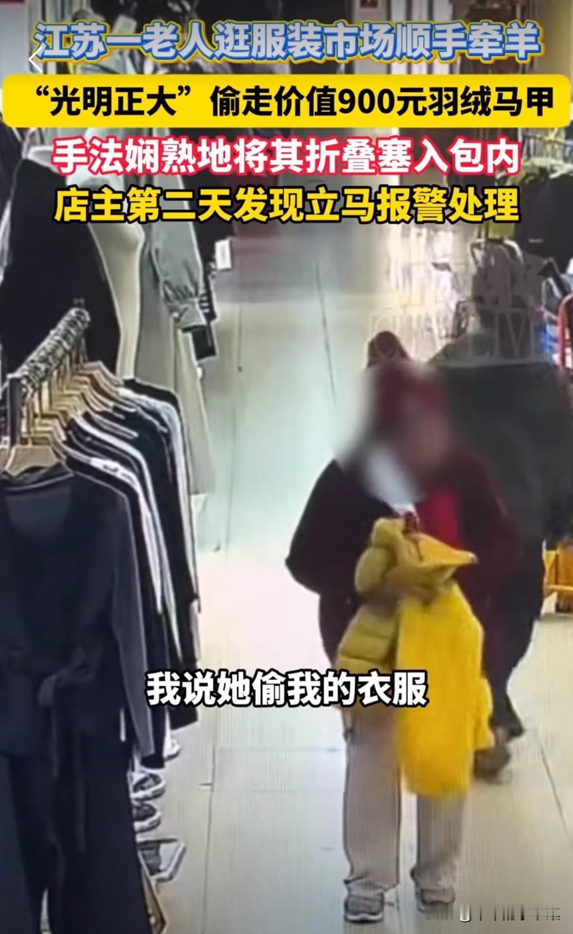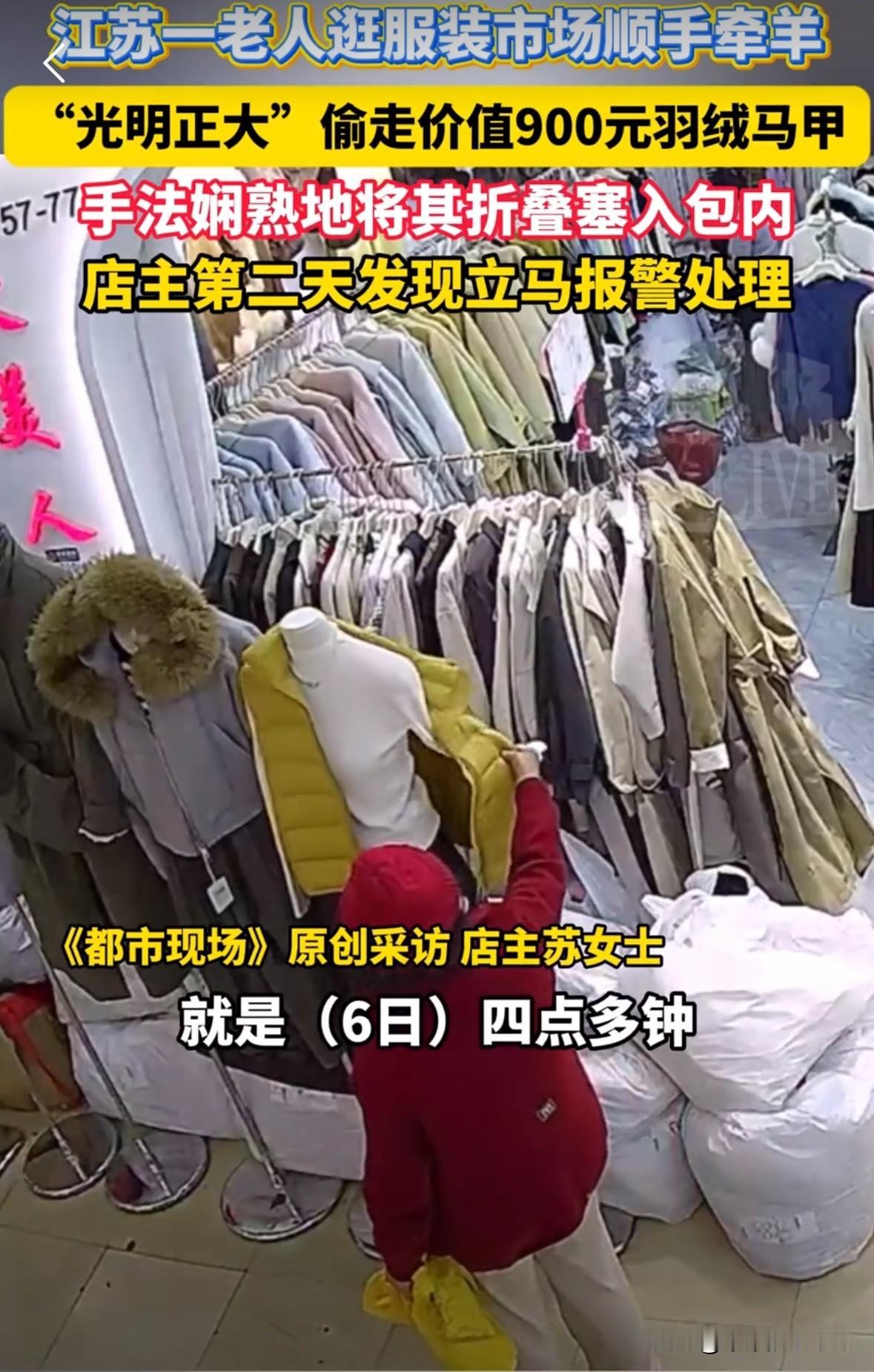 老人逛服装市场,看到一家店门口模特穿的马甲很好看,于是手法娴熟的从模特身上脱下来折叠好,放到自己随身携带的塑料袋里,然后若无其事的离开的。 一套动作行云流水,肯定不是第一次偷衣服。 店主第二天发现马甲不见了,于是调了店里的摄像头,发现是这个老人偷了,立即报了警! 店主说:我这个马甲鹅绒的,拿货价都900多,我们都在屋里忙着发快递,老人六七十岁。 现在的老人仗着自己岁数大,脸都不要了! 还有店主一个小马甲拿货价900多,那你卖货价不得一千多,就你这小店,你咋不去抢啊! 你的鹅绒羽绒马甲比黄金都贵你知道不。老人偷衣服