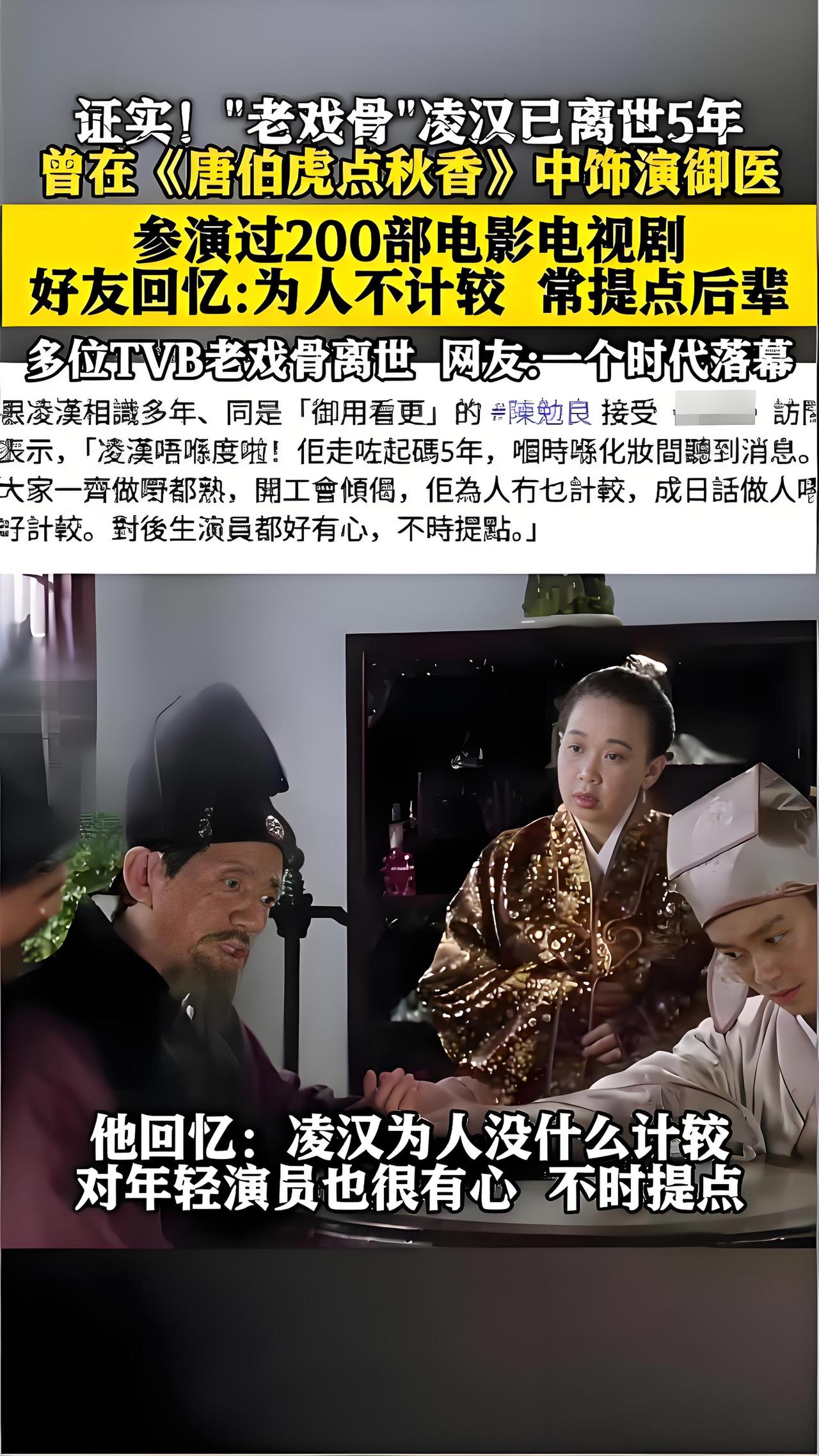 2025年11月8日,TVB老戏骨凌汉的死讯获“御用看更”陈勉良证实,其离世至少已有五年。凌汉初为邵氏编剧,后转战幕前,参演逾200部作品,以《唐伯虎点秋香》御医、《大闹广昌隆》福伯等角色深入人心。网友感慨:“一个时代真的过去了。”凌广济 凌文华 凌汉去世 凌汉