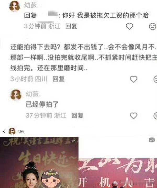 11月9日,吴谨言新剧《江山为聘》资金链出问题,有演员表示剧组拖欠工资,停拍后,
