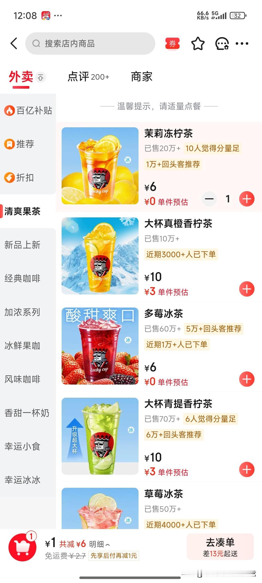 京东外卖杀疯了!奶茶直接0元喝?这波羊毛我先薅为敬! 刚刷到京东外卖的页面,直接瞳孔地震——幸运咖的茉莉冻柠茶,到手价0元? 点开店铺看傻了:一杯柠檬茶标价6块,百亿补贴券一叠,居然真能0元拿下!这还不算完,旁边葡萄冰茶、草莓冰茶全是1块钱的价,合着奶茶直接按“白给”卖? 想起之前某平台凑单凑到脑壳疼,这边直接把“薅羊毛”写在脸上了——蜜雪冰城套餐减12块,沪上阿姨奶茶4块钱一杯,连古茗的青橘柠檬水都只要1块…这是把奶茶店的利润按在地上摩擦啊! 不过话说回来,这0元购真能一直有?不会是新用户的“一次性福利”吧?毕竟之前某平台刚上线也这么疯,后来该涨的价一点没少。 你们说,这波京东外卖是来抢市场的“诚意杀”,还是割完韭菜就跑的“短期套路”?反正我先冲了,你们敢不敢跟?