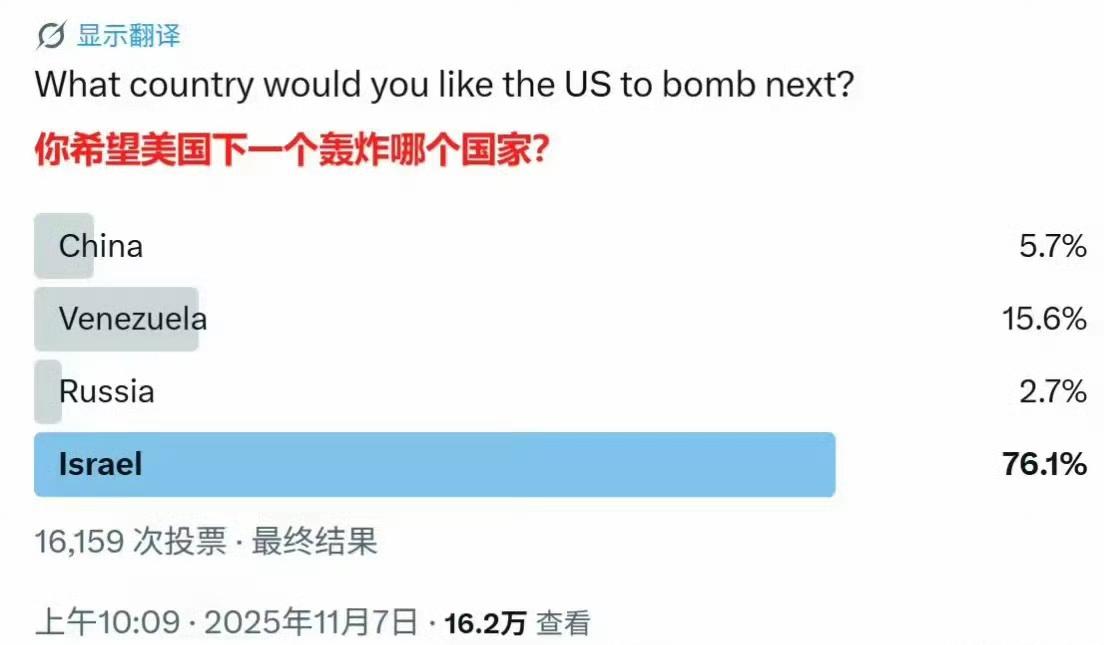 推特上的投票,最希望美国下一个轰炸哪个国家?美国人一天到晚吃饱饭闲得慌,尽想惹事。
