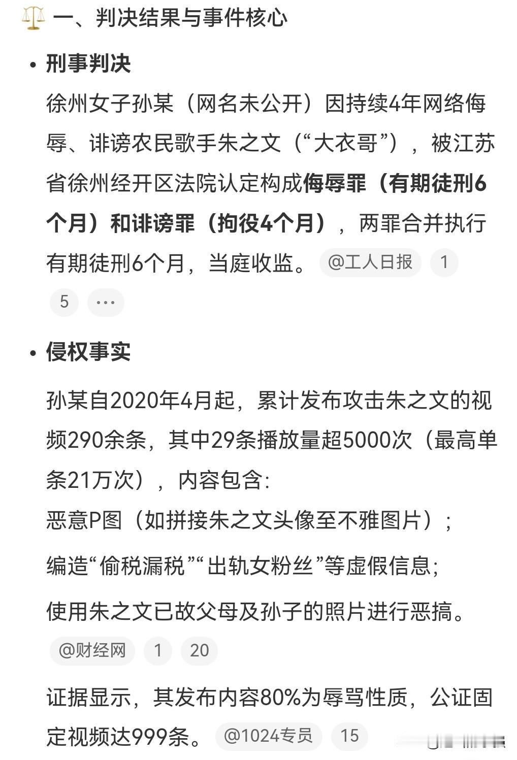 这胆子也太大了吧,有一个女人竟然在网上连续4年辱骂大衣哥,这真是无法无天啊。 11月9日(报道),连骂4年大衣哥的女子被判6个月。 还发布了道歉视频,她请大家不要再网暴她了。 她现在知道错了,也知道网暴的滋味不好受了,她以前那么网暴大衣哥,真的是太丧心病狂了。