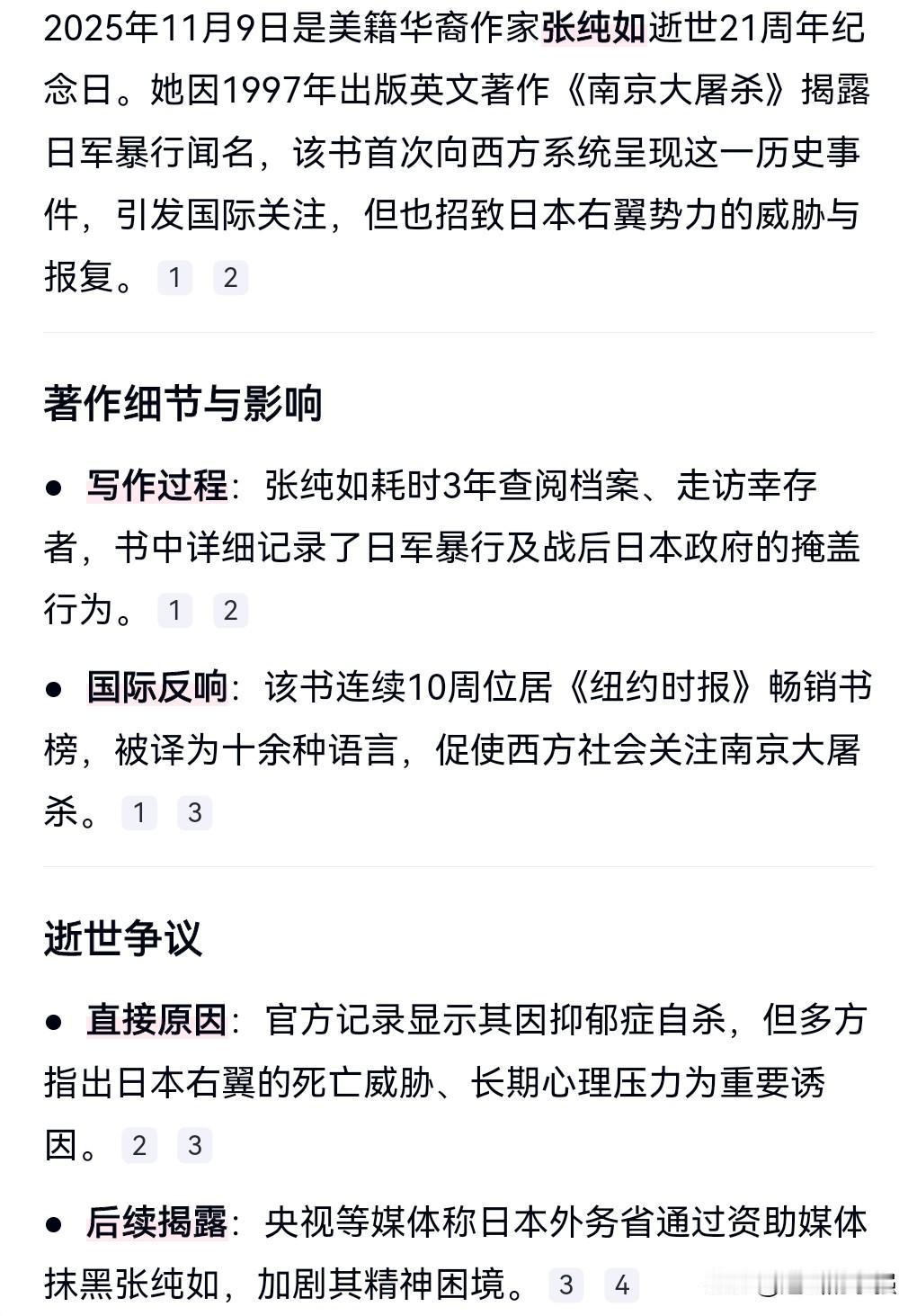 张纯如是一个伟大的作家,出版英文著作《南京大屠杀》而闻名世界。 但是她面临着很大的精神压力,包括很多无良日本人的威胁。 这就使她的精神世界相当的痛苦。 最终选择了自杀。 11月9日是张纯如逝世21周年。 当一个人承受巨大的压力时,总有一天会受不了的。