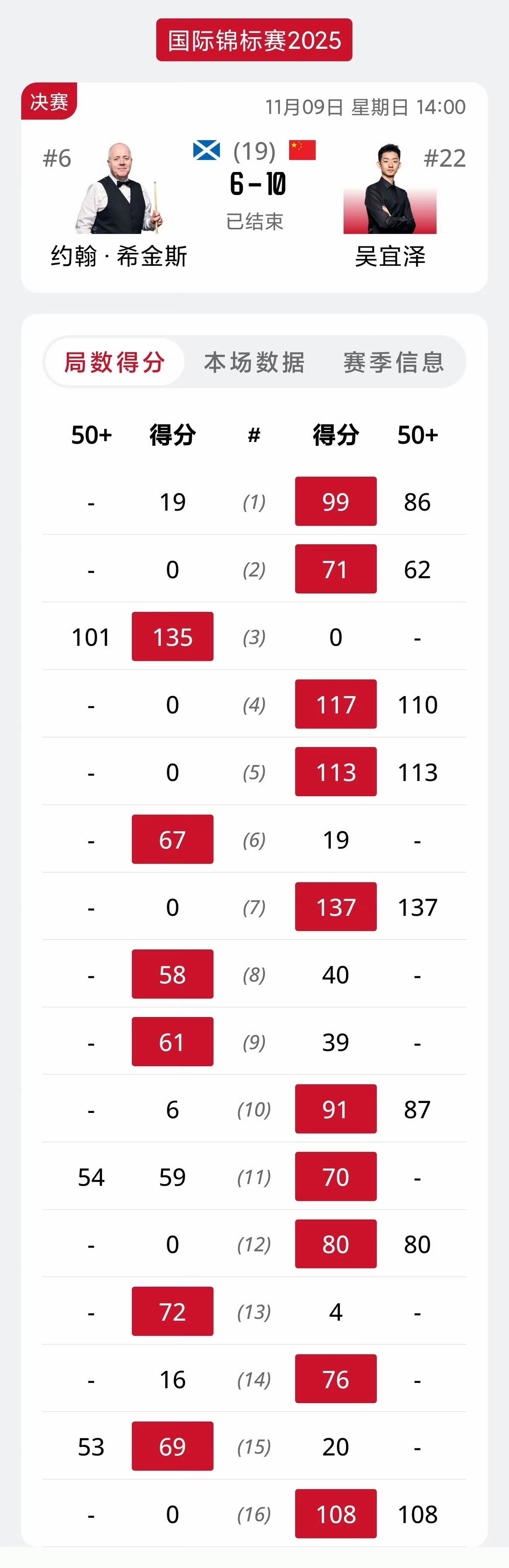 10-6!一路击败3位世界冠军,吴宜泽收获职业生涯首冠,他仅仅只有22岁。赛前谁能想到冠军是他? 凭借这次夺冠收获17.5万英镑,排名升至第13,单杆破百来到24杆也跻身世界前五。吴宜泽夺冠之路: 首轮:6-3蓝裕豪 次轮:6-1吕昊天 第三轮:6-3张安达 1/8决赛:6-4特鲁姆普 1/4决赛:6-0霍金斯 半决赛:9-6赵心童 决赛:10-6希金斯