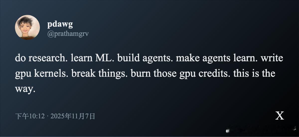 做AI,不只是学理论,更要亲自上手:研究、写代码、做agent、让agent自学习,甚至自己写GPU内核。不断试错、拆解、重构,烧掉GPU资源,才能真正成长。这才是掌握AI的“正道”。