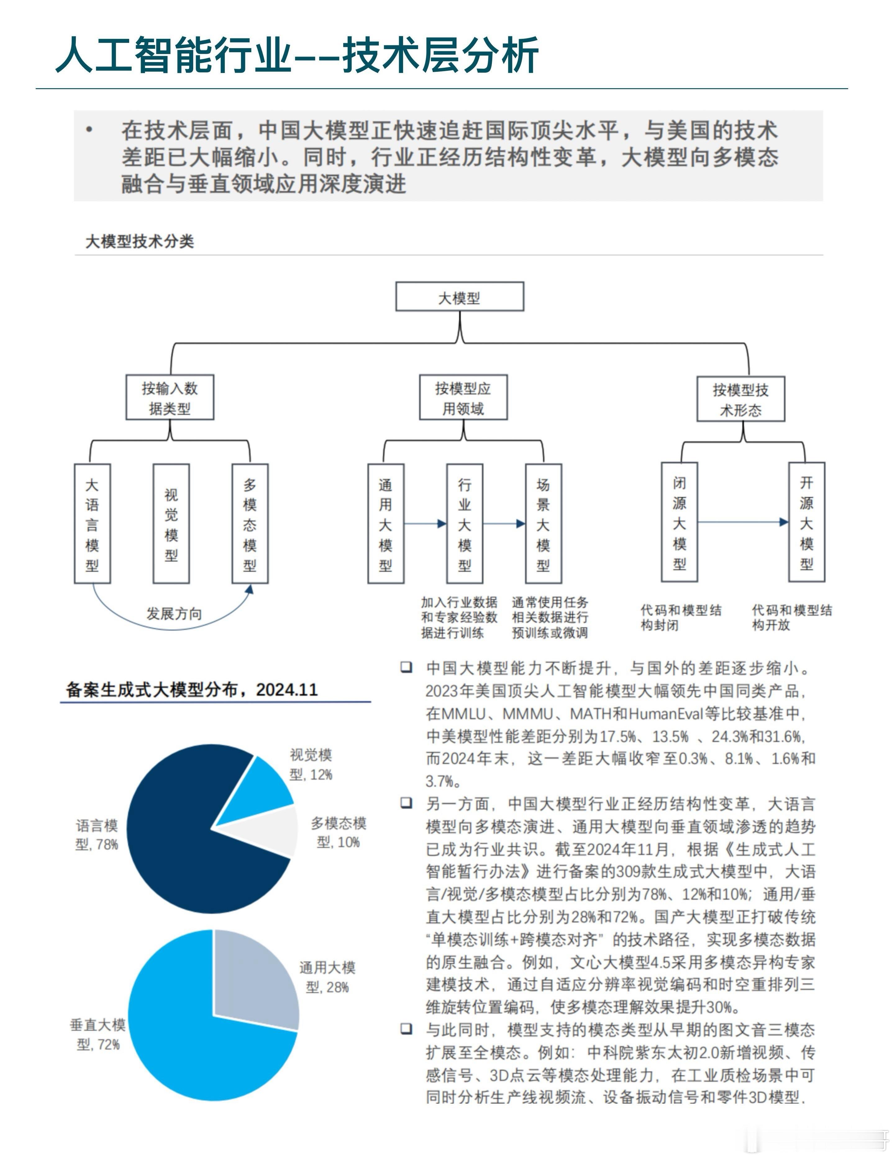 中美性能差距已快速收窄至个位数,中国在Qwen与DeepSeek等开源体系上重构了成本–性能曲线;同时,垂直大模型占比升至七成,多模态成为核心突破口,显示中国有望在行业应用深度和普惠化路径上实现“弯道超车”。