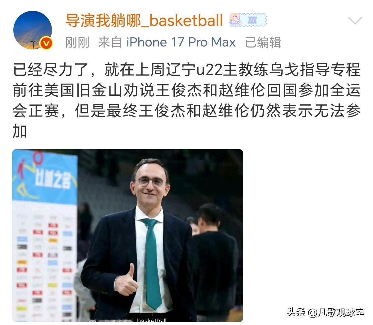 难以置信!一个俱乐部的外籍助教远渡重洋赴美劝说王俊杰和赵维伦回国代表辽宁男篮U22参加全运会,乌戈真的是太敬业了,作为外籍助教,对全运会都如此上心,真是难能可贵,如果说马布里为北京篮球作出贡献,最后北京为老马建一座铜像,那么乌戈为辽宁篮球的付出也值得沈阳为他建一尊铜像!