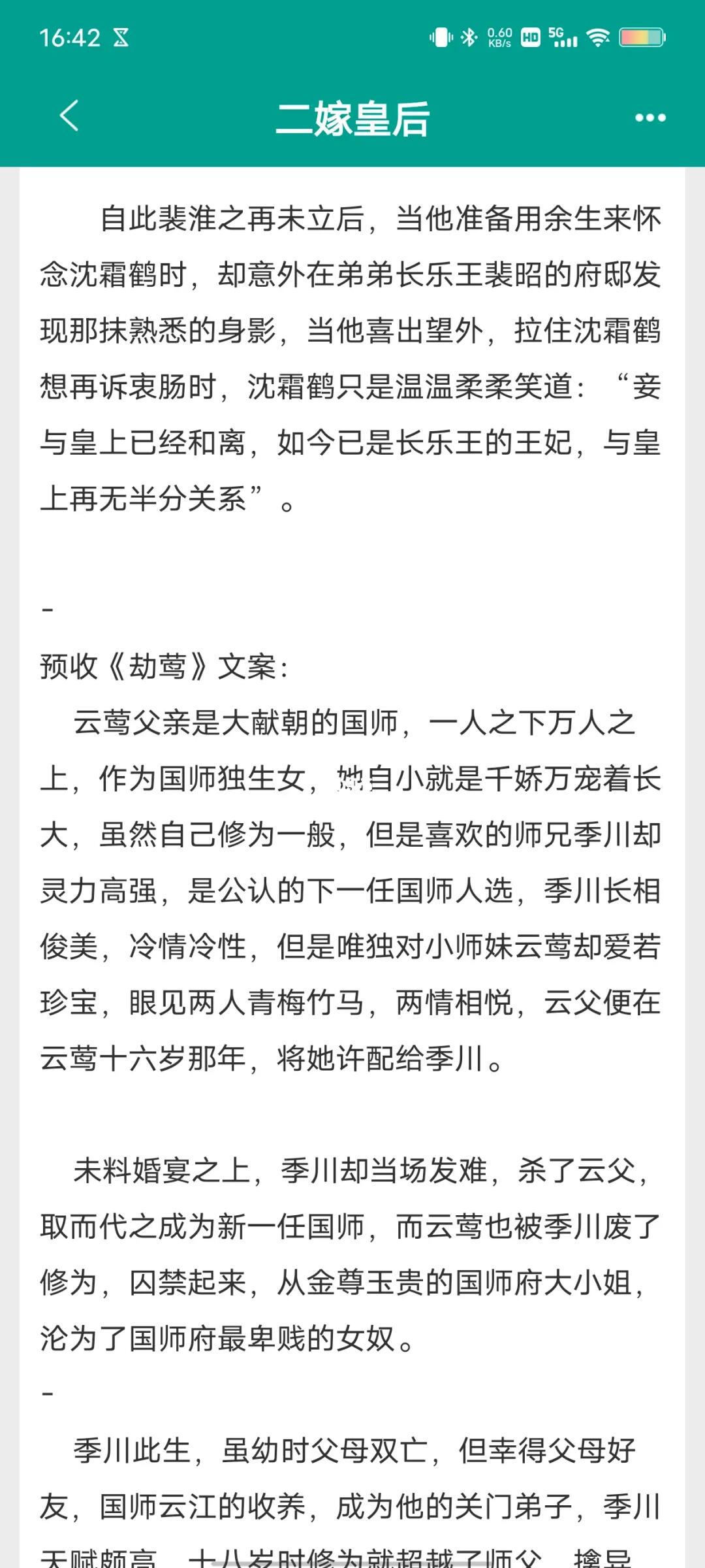 《二嫁皇后》by芸香青柠 23年完结的文,一共87章 女主是皇后,死遁后嫁给男二 前夫皇帝追妻火葬场扬灰