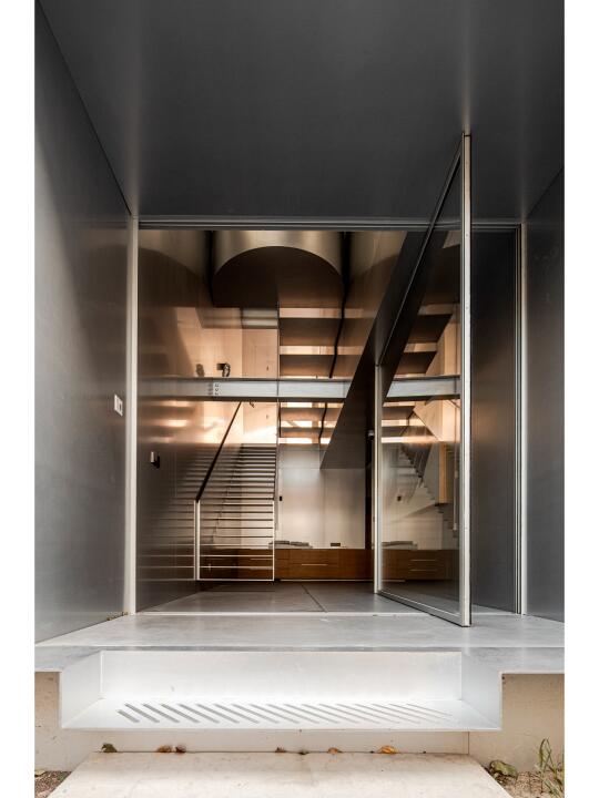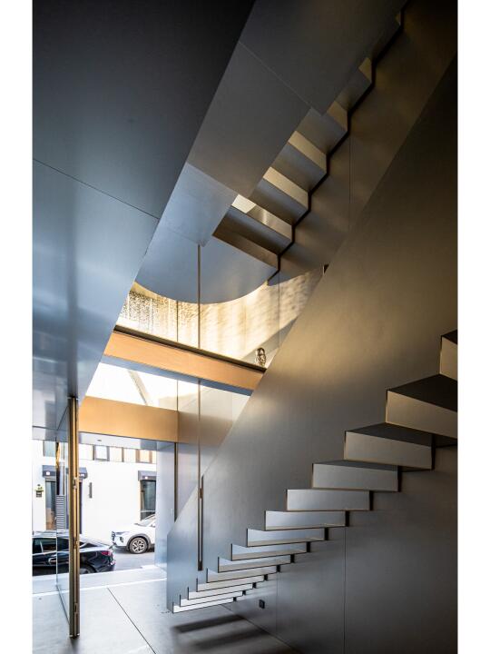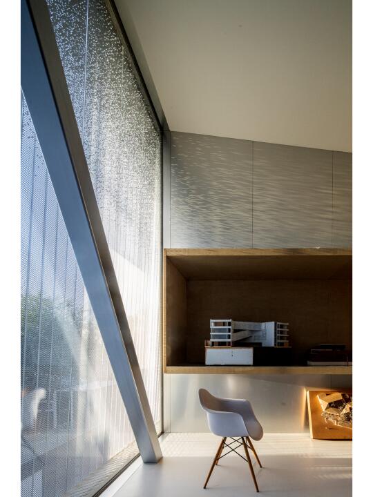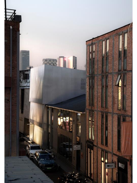 建筑外墙被阳极氧化铝板所包裹,设计团队选择了柔和的反光材料。为了避免过多的日晒,同时也避免与对面建筑的对视,整个西侧的铝板进行了冲孔,使得简洁的建筑形体具有半透明性,被嵌入到周围参差不齐的砖墙建筑形成的环境当中。