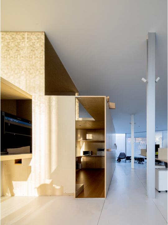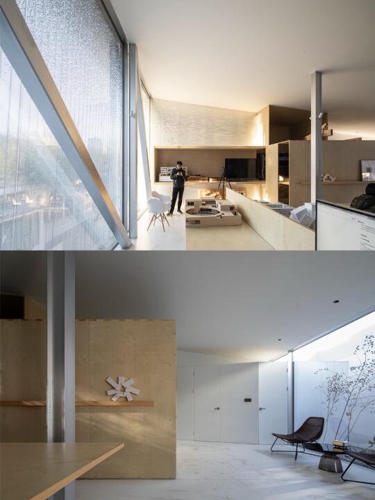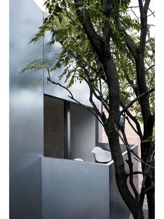 将拆除中意外发现的建筑夹缝中狭小的空地扩展作为一楼的小院,这里恰好有一棵大树,成为了室内的风景。三楼也因此做了一个挑出的阳台,以便工作的闲暇可以在树下小坐。