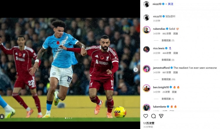 奥赖利也通过社媒晒出自己对位萨拉赫的比赛照,并配文“硬!”表达自己的兴奋之情。